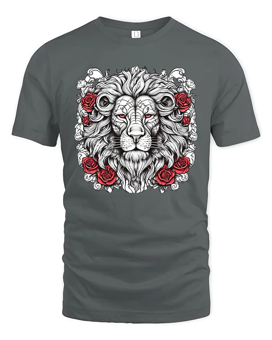 This lion t shirt features a highly detailed lion face surrounded by bold red roses drawn in a dramatic tattoo inspired style.