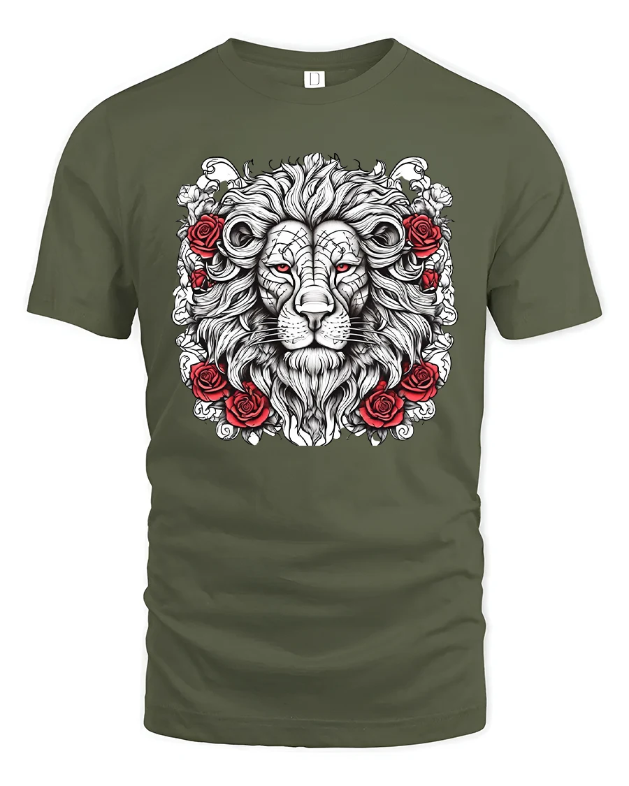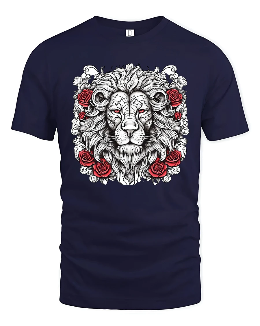 The Majestic Lion Rose Tattoo Style Art T Shirt represents strength elegance and timeless symbolism in a striking visual design.