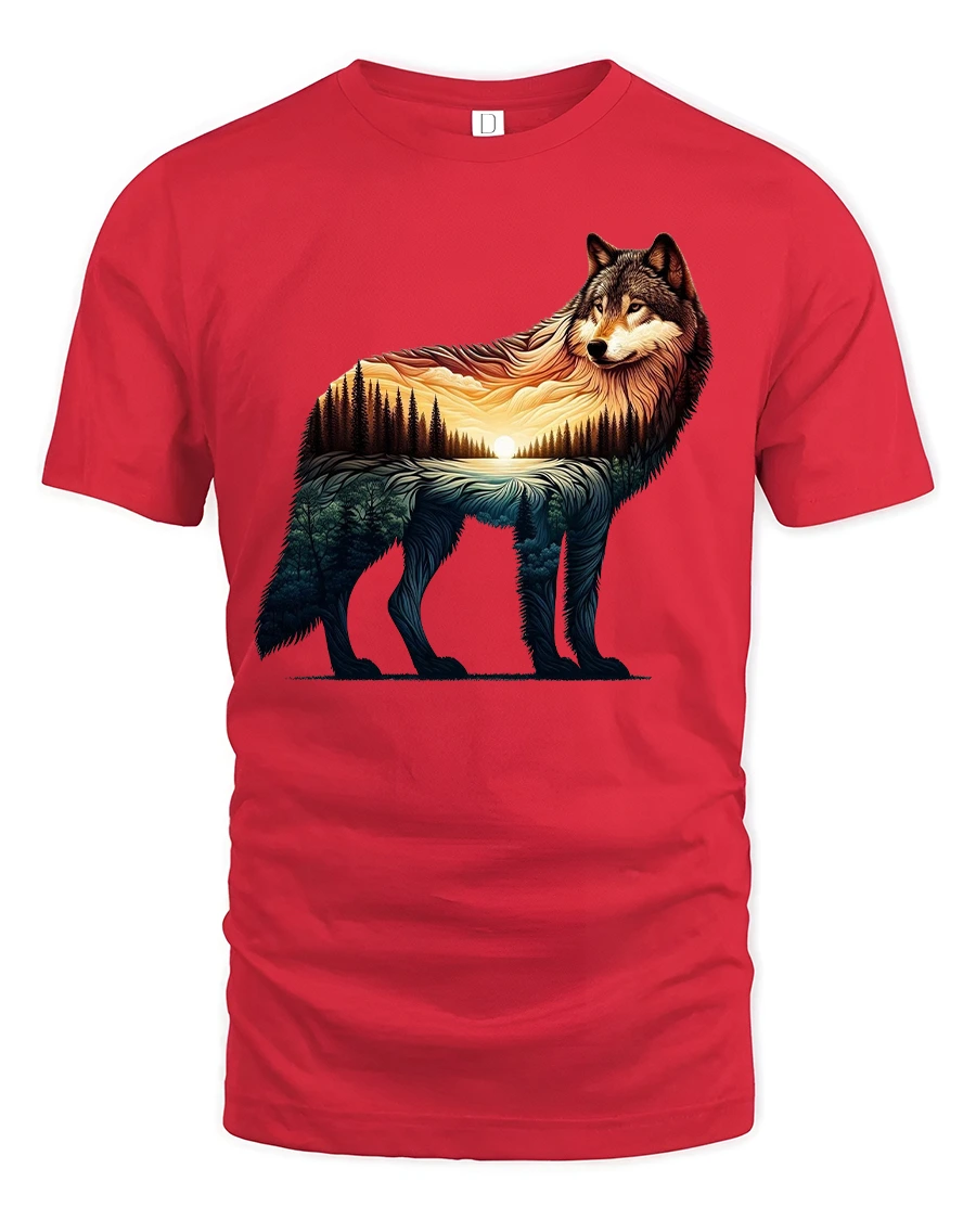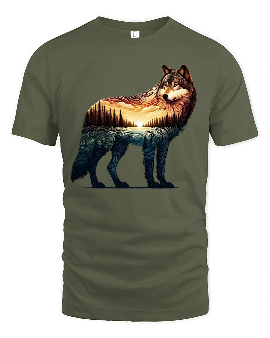 Celebrate the beauty of the wild with this Majestic Wolf Sunset Landscape T Shirt Nature Art Tee that blends powerful wildlife imagery with breathtaking scenery. The design features a detailed wolf silhouette filled with a glowing sunset, pine forests, and rolling landscape, creating a stunning double exposure effect. Warm golden tones fade into deep forest shades, capturing the peaceful yet powerful spirit of nature in one artistic graphic.