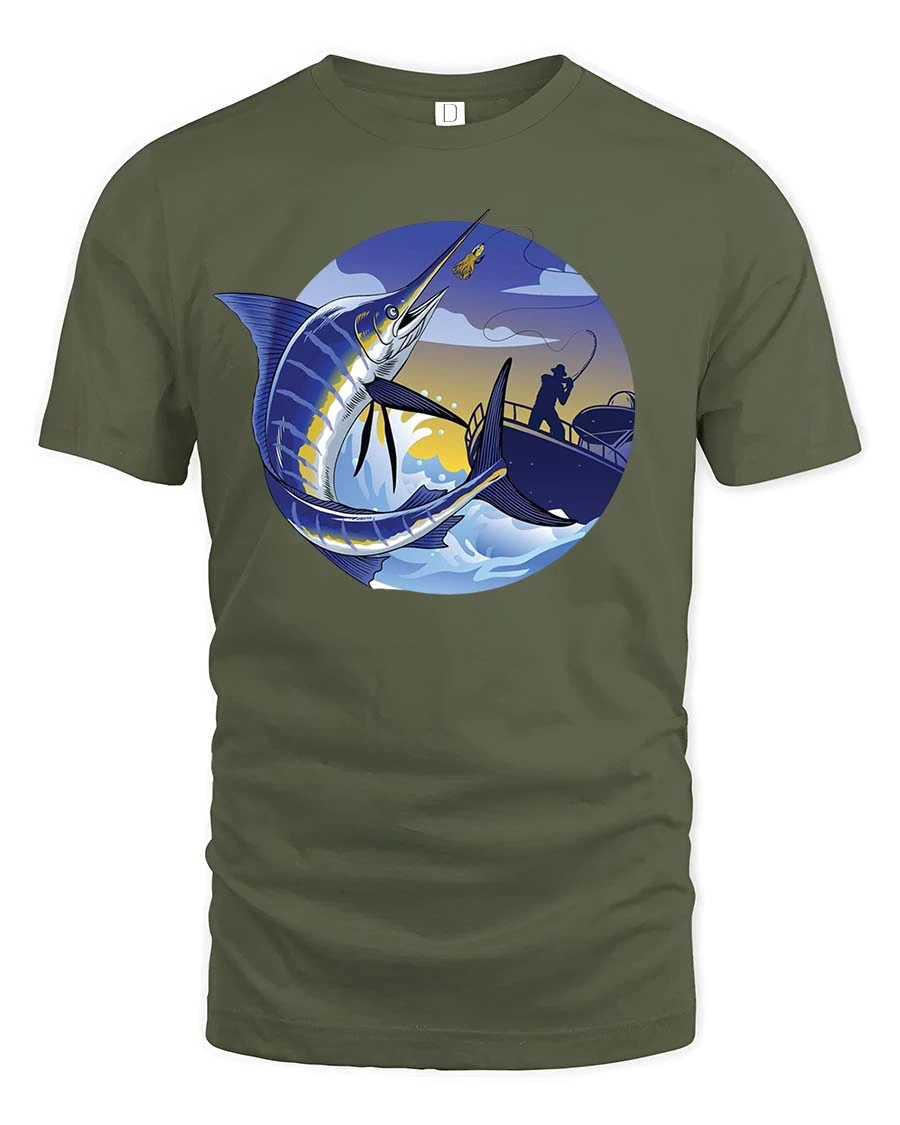 Marlin Fishing Sunset Graphic t-shirt Deep Sea Angler Tee captures the excitement of sport fishing through a vibrant ocean inspired illustration.