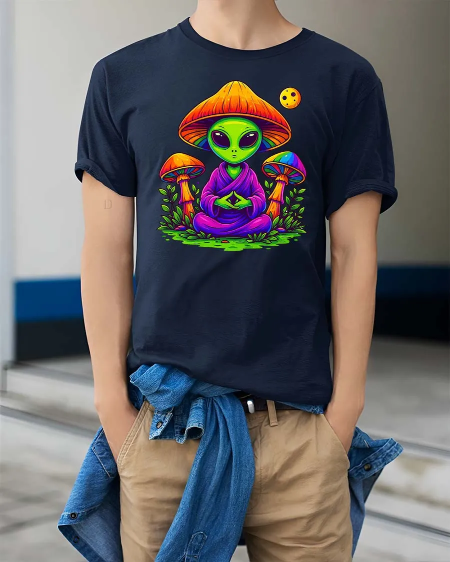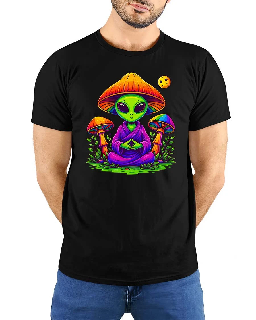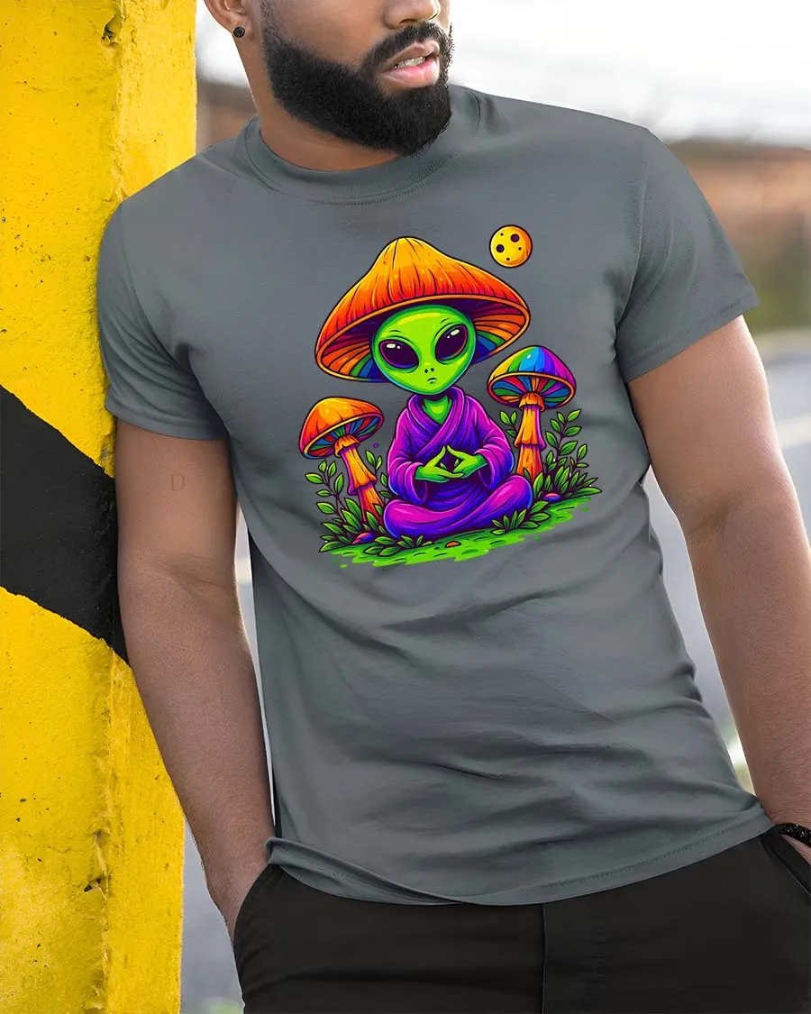 Meditating Alien Mushroom Psychedelic Graphic t-shirt pairs easily with streetwear casual outfits or layered creative fashion.