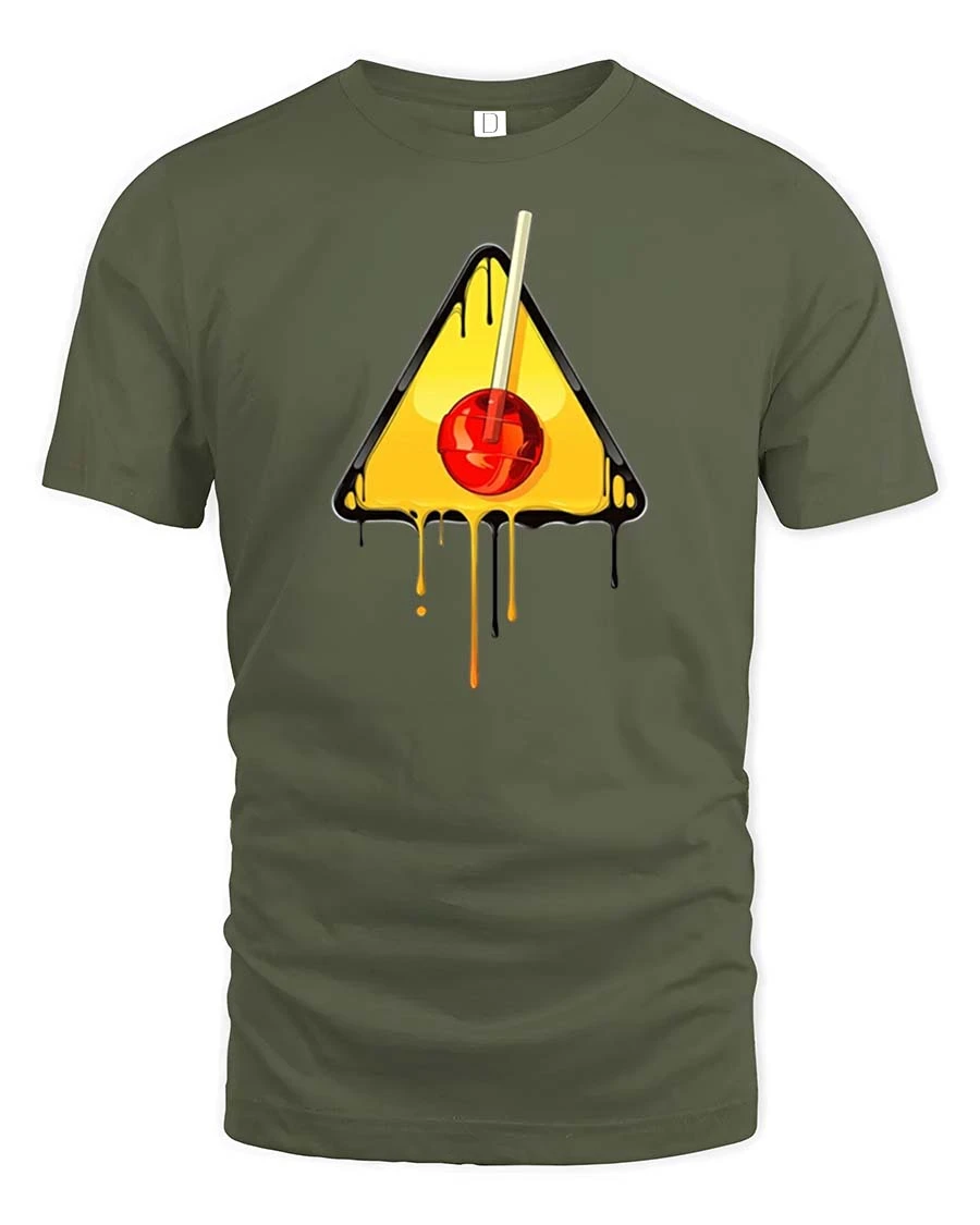 Melting Cherry Warning Sign Graphic t-shirt Cool Art Tee - military green t-shirt on white background