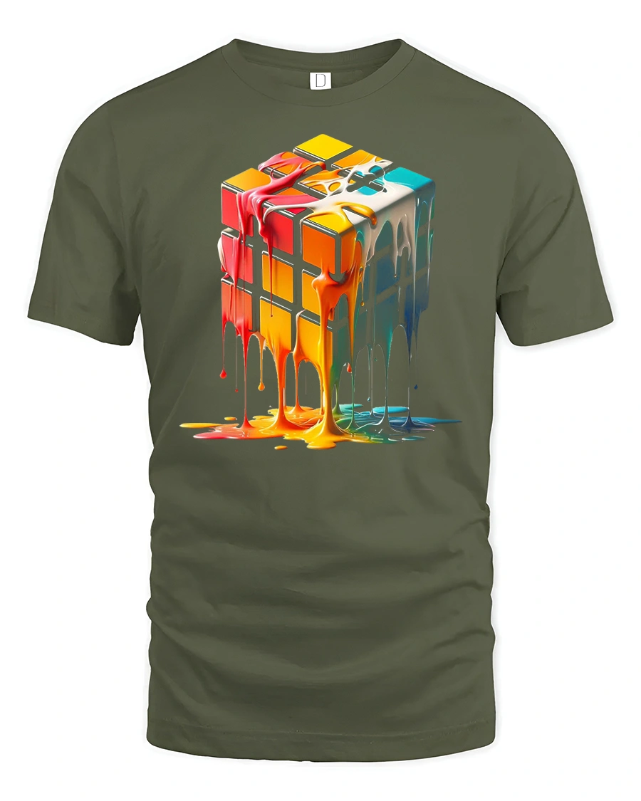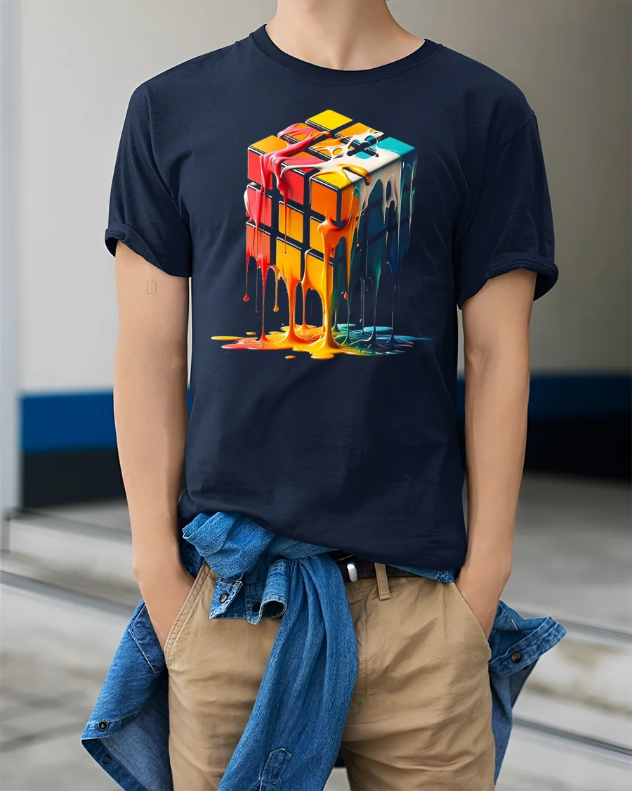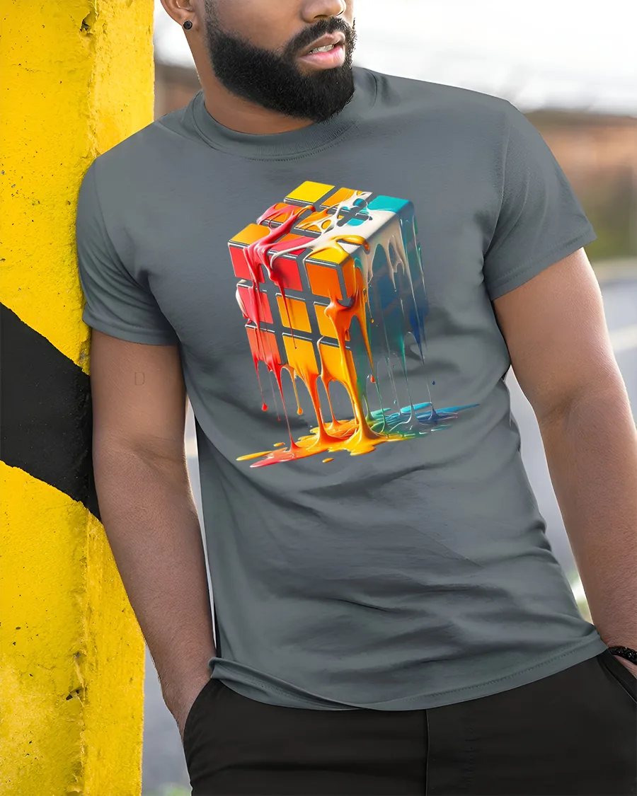 The Melting Color Rubik Cube Abstract Art Graphic Tee features a bold and creative design that blends modern art with a playful visual twist.