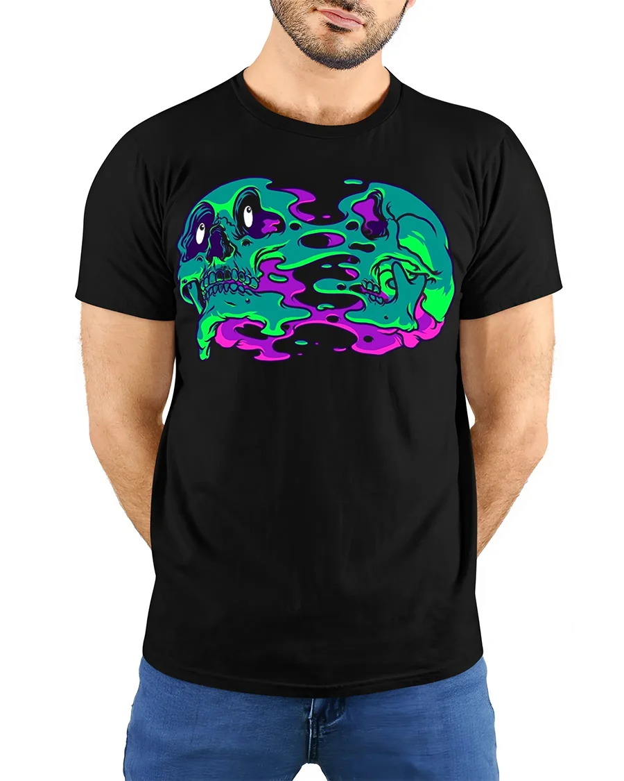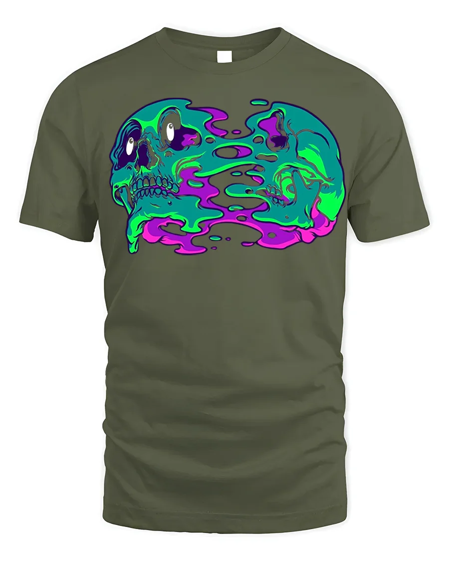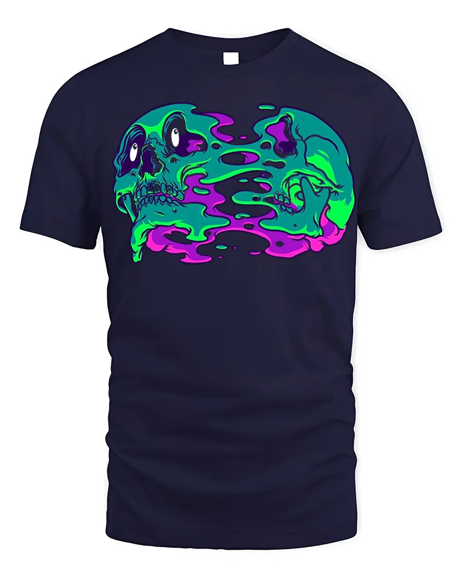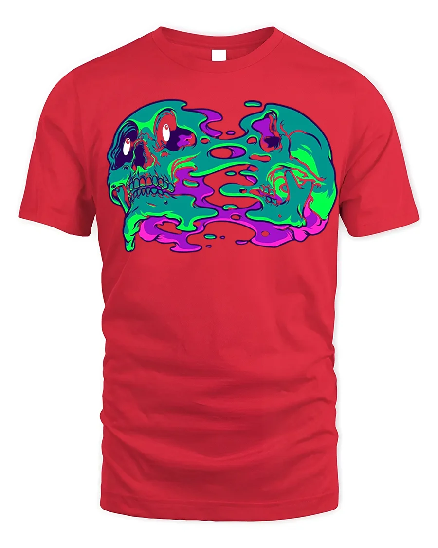 This edgy tee features two stylized skulls appearing to melt or merge together in vibrant neon hues of green and purple.