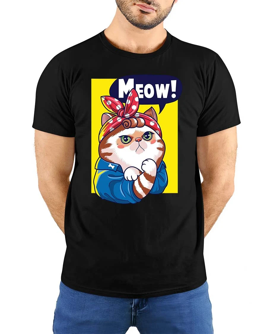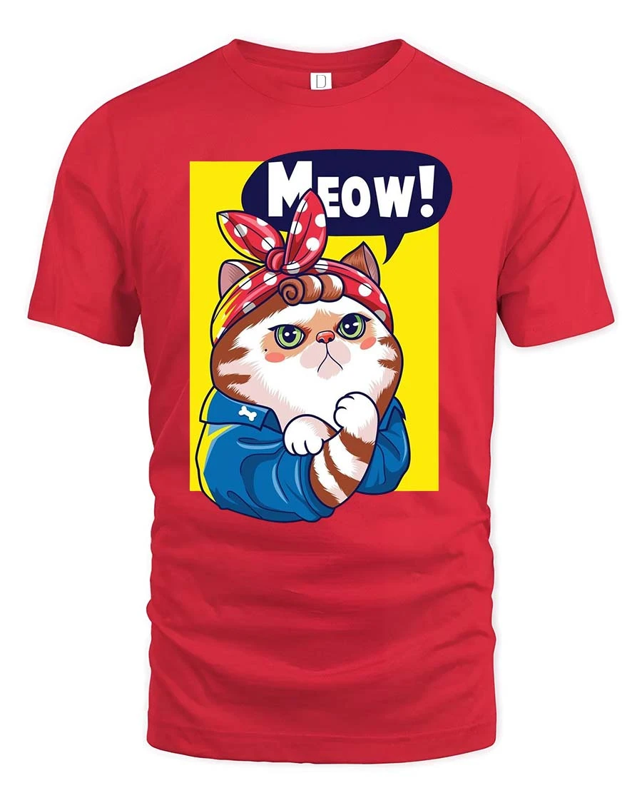 Featuring an adorable cartoon cat with a retro-inspired look and a playful “Meow” speech bubble, this t-shirt delivers a cute and expressive vibe.
