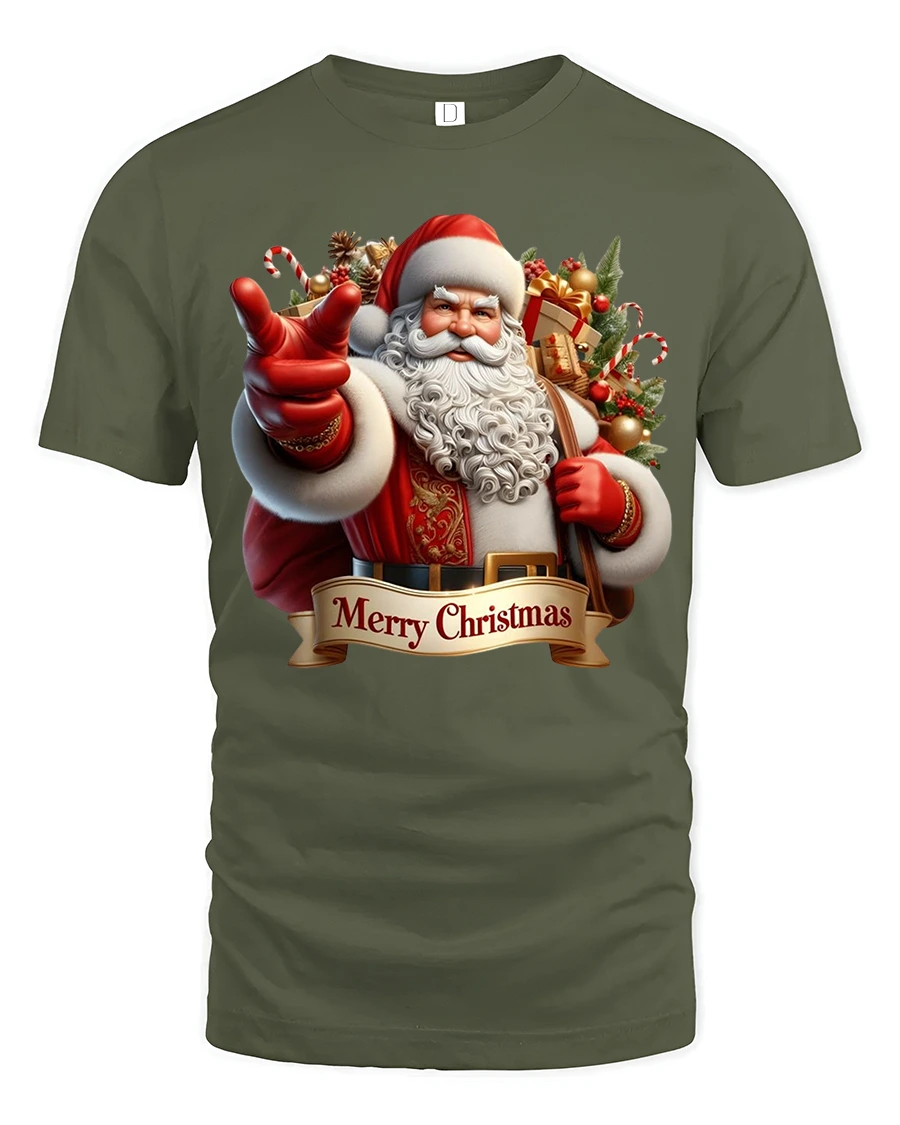 Merry Christmas Santa Pointing Graphic Tee With Festive Spirit - military green t-shirt on white background