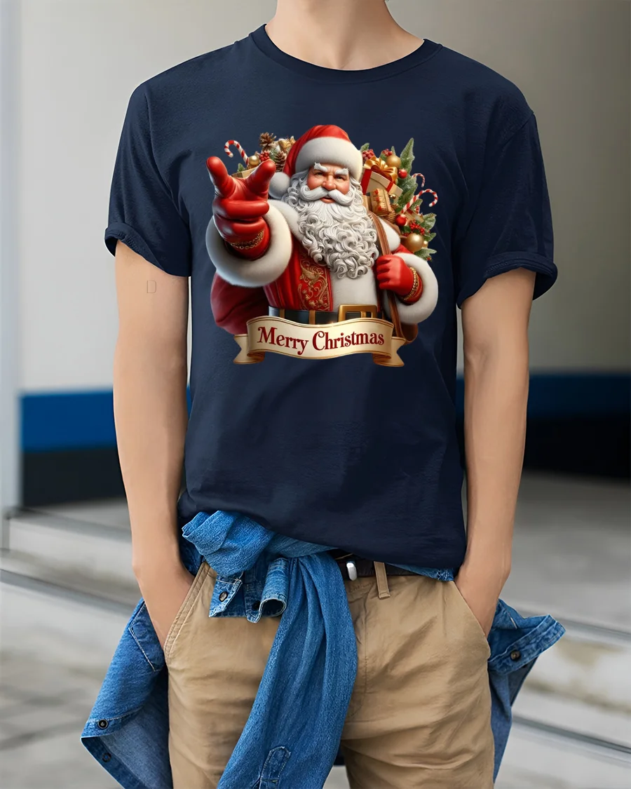 The Merry Christmas Santa Pointing Graphic Tee With Festive Spirit is ideal for anyone who loves traditional holiday imagery with a fun twist.
