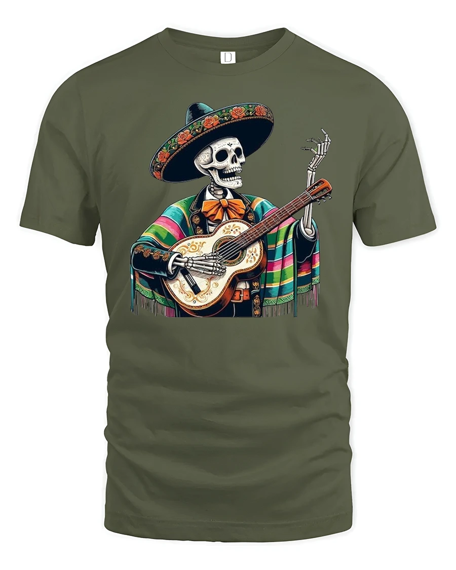 Ideal for festivals, themed parties, concerts, or everyday wear, this t-shirt is perfect for anyone who appreciates Mexican cultural art or loves unique musician-themed graphics. The design balances traditional elements with a modern illustrative style, making it both eye-catching and meaningful. Whether you’re attending a Day of the Dead celebration or adding artistic flair to your wardrobe, this tee adds personality and charm.