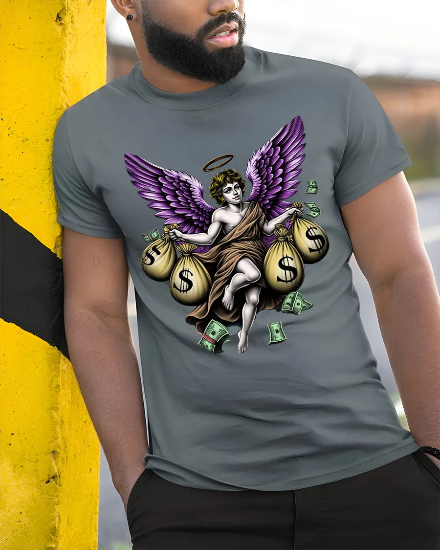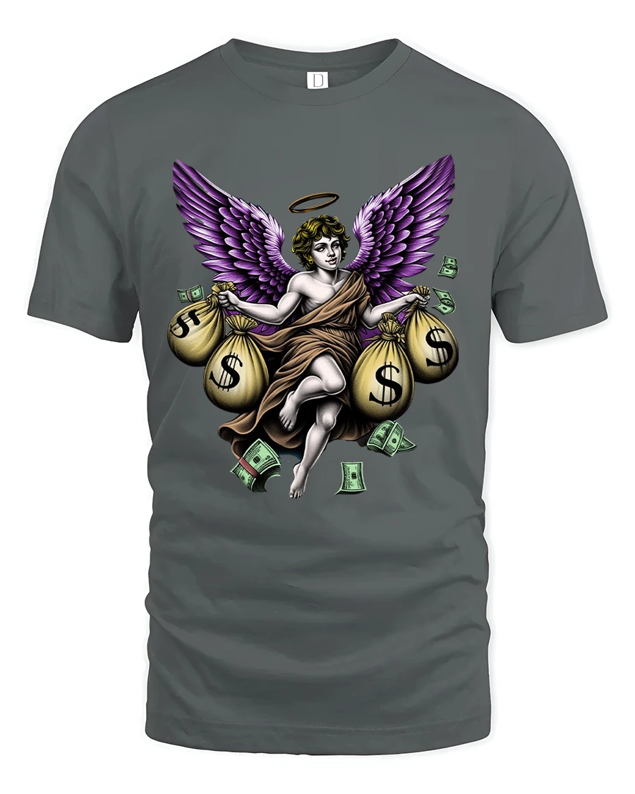 The money angel graphic t shirt features a striking illustration of a powerful angel with vibrant purple wings holding bags of cash.