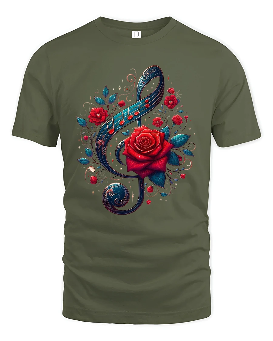 Musical Rose Art Tee with Elegant Treble Clef Floral Design - military green t-shirt on white background