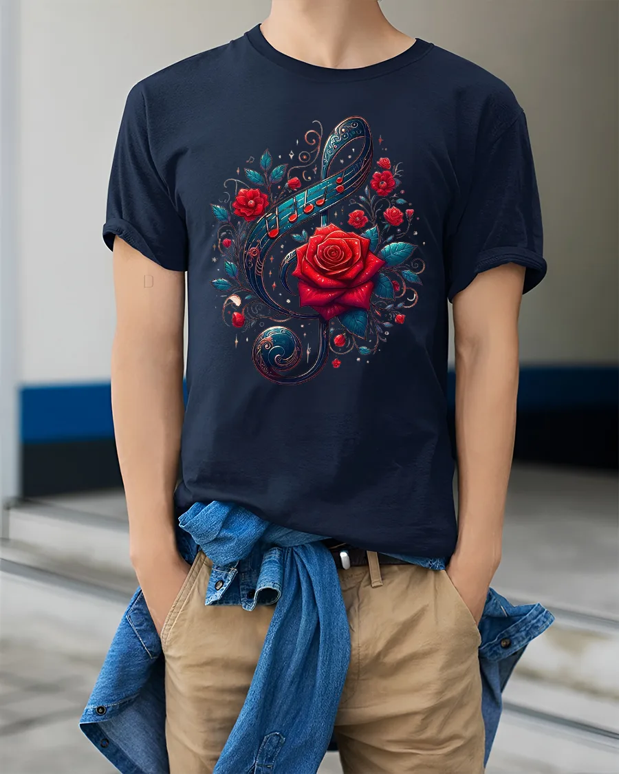 This Musical Rose Art Tee with Elegant Treble Clef Floral Design blends the beauty of music and the timeless symbolism of roses into one striking graphic. The centerpiece features a detailed treble clef shape intertwined with blooming red roses, vibrant leaves and graceful swirls that create a sense of movement and artistic harmony. The rich colors and refined illustration style make this tee ideal for anyone who loves expressive artwork with a musical twist.