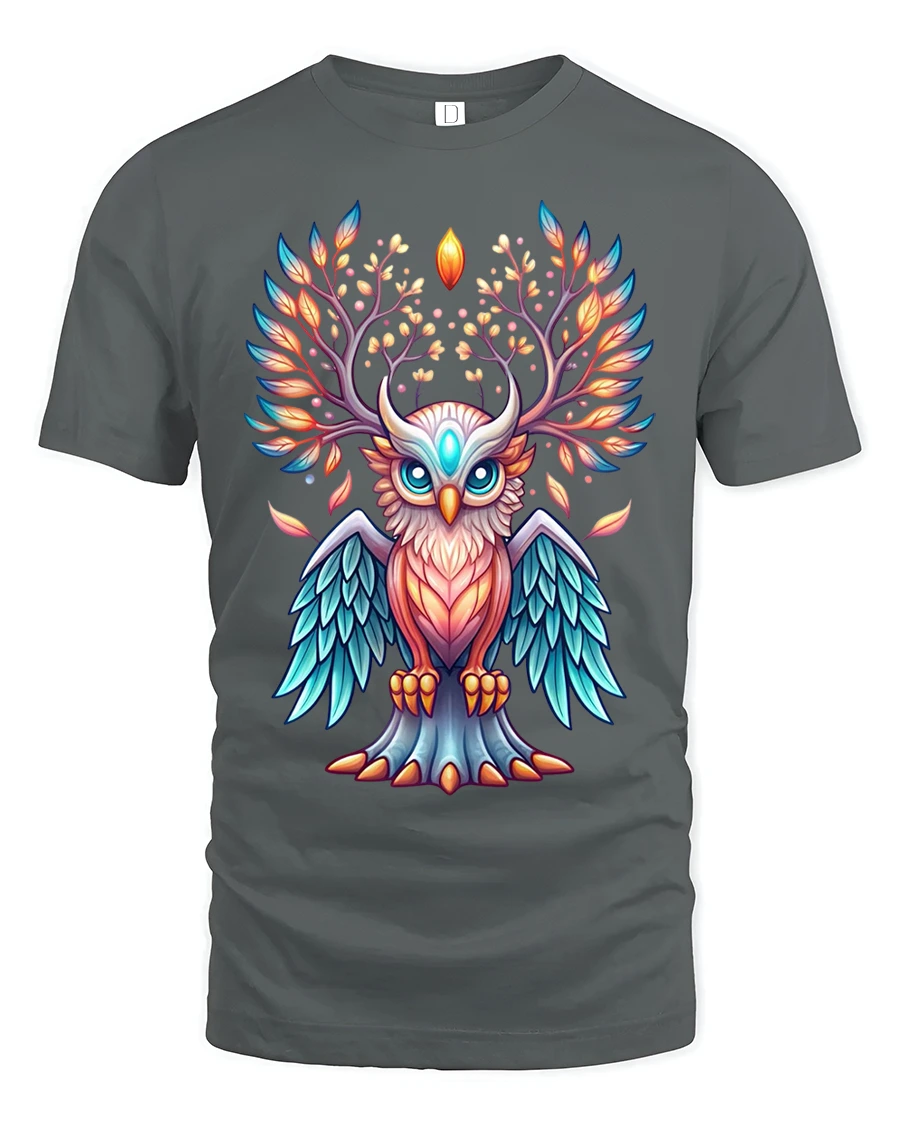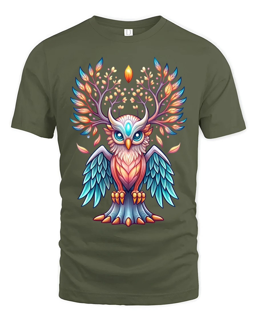 Mystic Antlered Owl Spirit Tee with Glowing Fantasy Art Design brings a bold and vibrant twist to mythical creature apparel. This unique tee showcases a beautifully illustrated owl with radiant eyes, majestic wings, and intricate antlers that bloom like enchanted branches. Its glowing, colorful details create a magical energy perfect for fans of fantasy art, festival fashion, and expressive graphic tees.