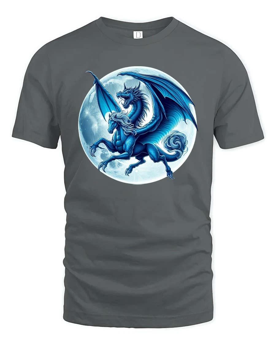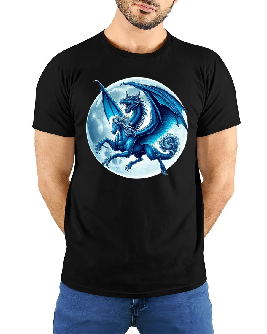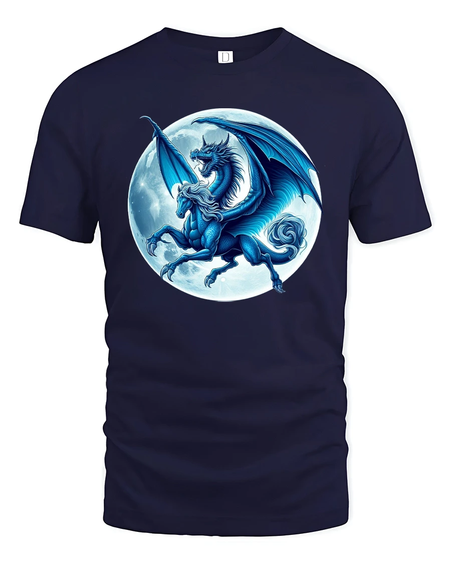 Mystic Blue Dragon Moonlight Fantasy Graphic T-Shirt is the ultimate piece for fantasy lovers who want bold and imaginative fashion. The design features a powerful dragon-pegasus hybrid soaring under the glowing full moon, its wings spread wide in a breathtaking pose. With its shimmering blue tones and intricate detailing, this shirt captures the magic and mystery of mythical creatures.
