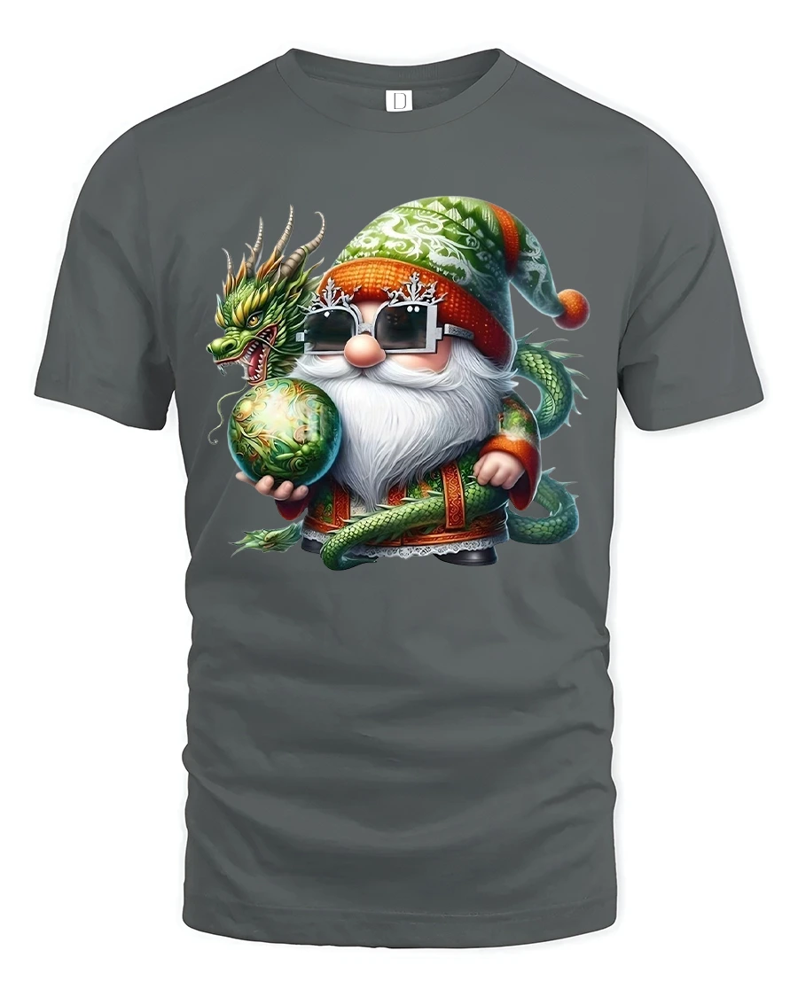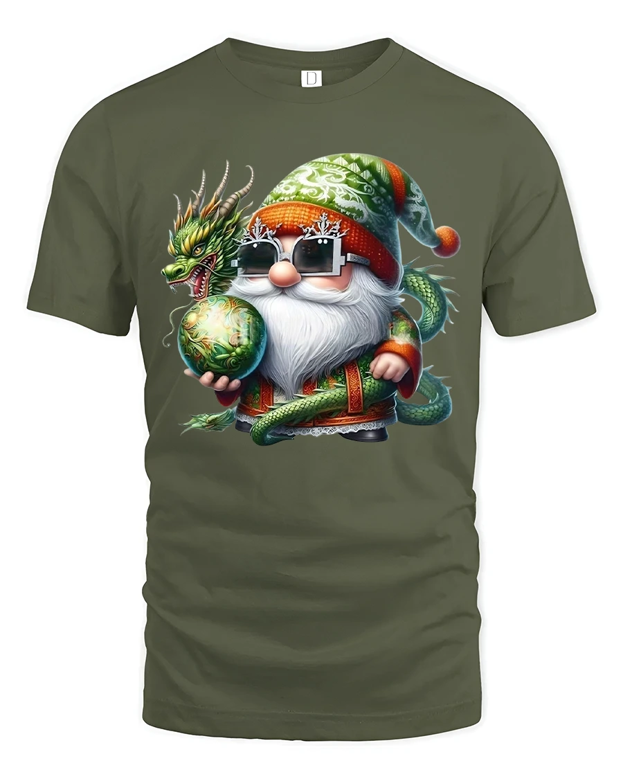The Mystic Dragon Gnome Wizard Fantasy Art Cartoon Graphic Tshirt features a charming and powerful fantasy illustration.
