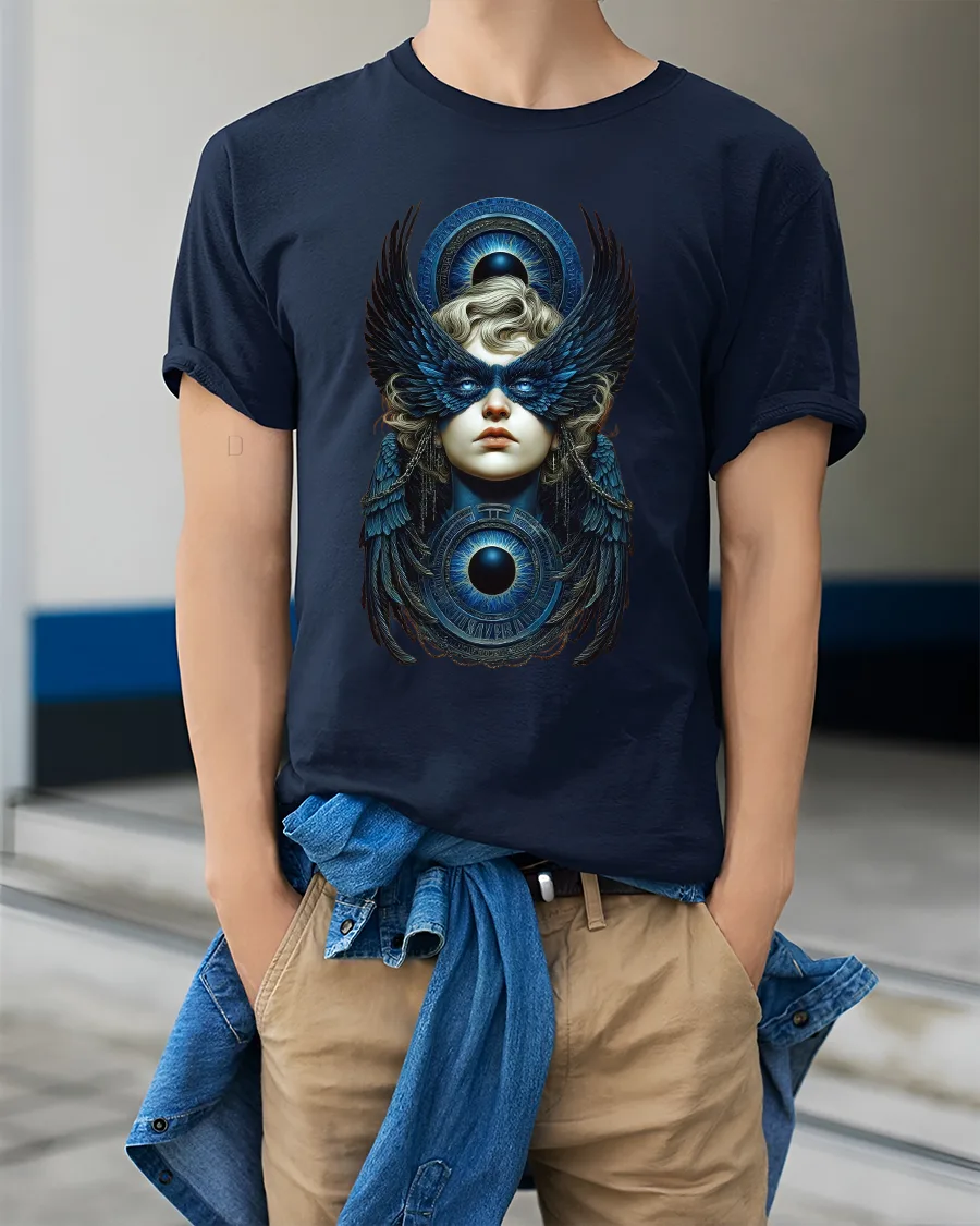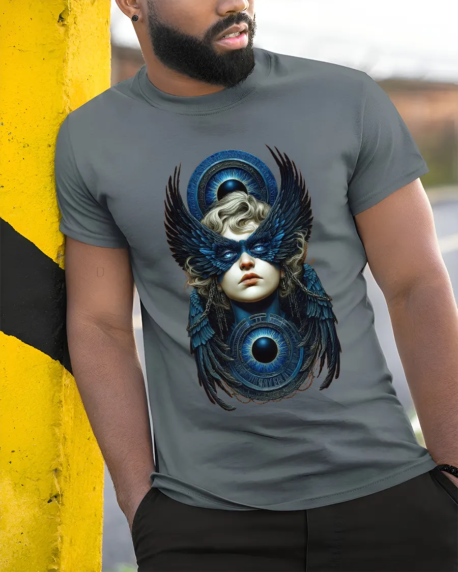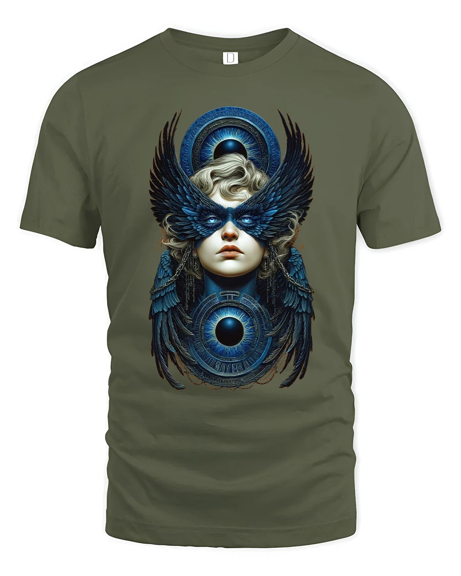 Mystic Winged Oracle Tee showcases a powerful fusion of fantasy symbolism and celestial beauty.