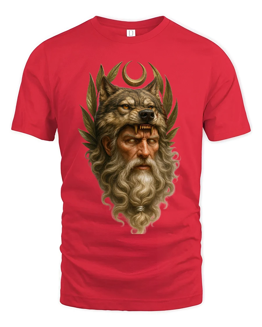 Mystic Wolf King Elder Warrior Art Graphic Tshirt Ancient Power - red t-shirt on white background