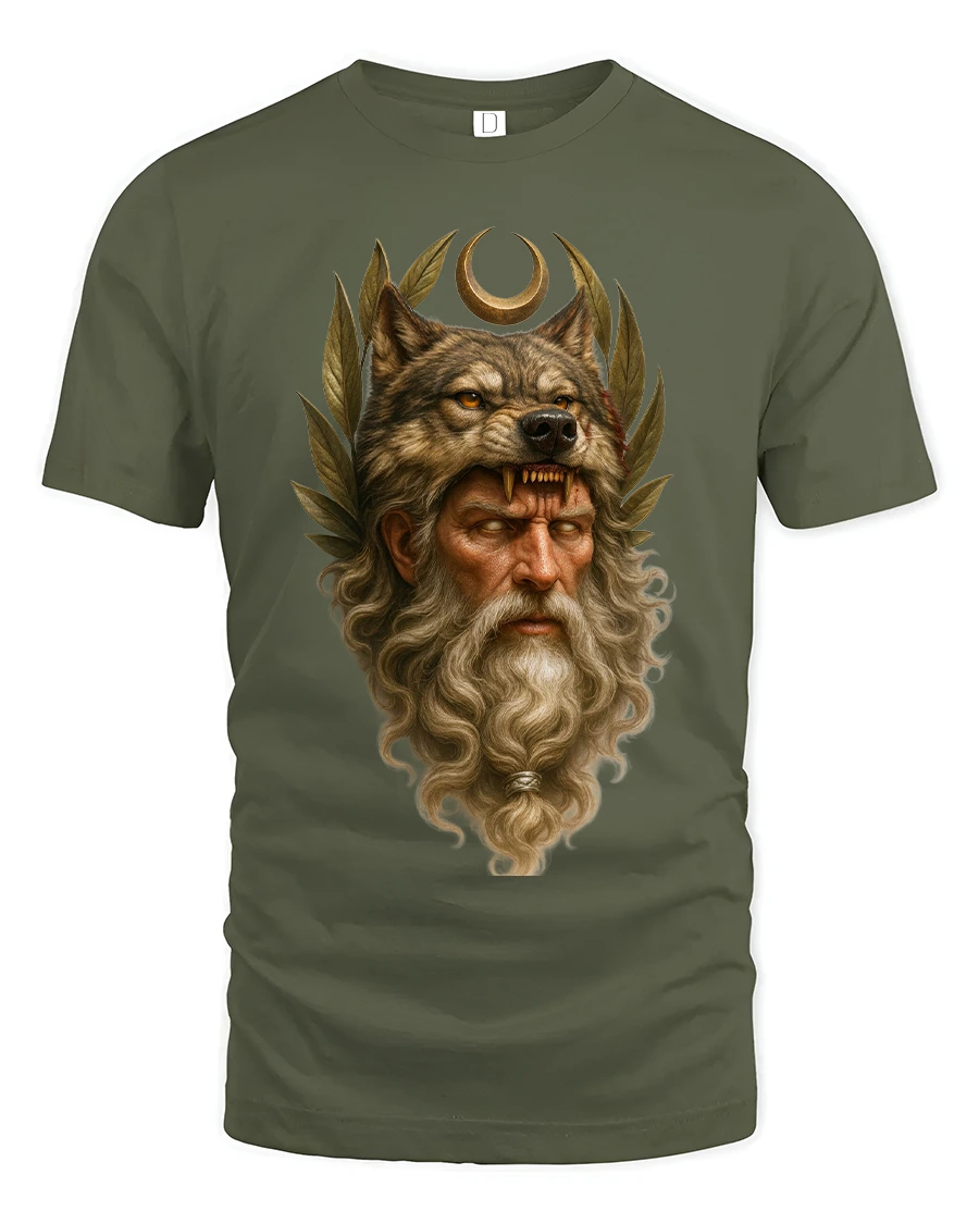 Mystic Wolf King Elder Warrior Art Graphic Tshirt Ancient Power - military green t-shirt on white background