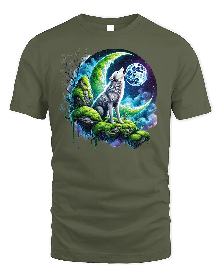 Mystical Wolf Howling at Moon T-shirt - military green t-shirt on white background