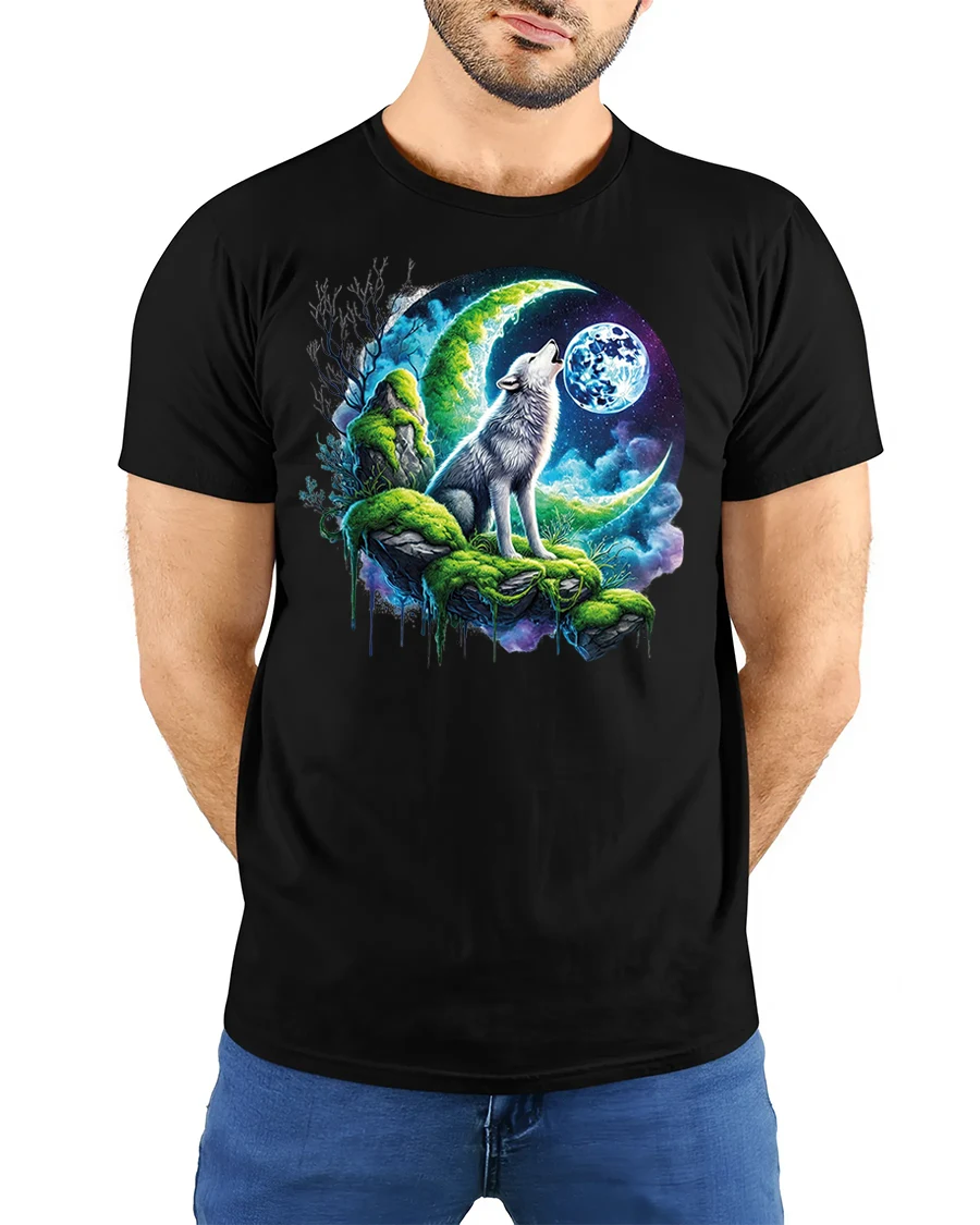 Made with high-quality, breathable fabric, this wolf howling t-shirt is comfortable for all-day wear while keeping the vivid print sharp and eye-catching. The detailed artwork with its vibrant greens, blues, and galaxy tones makes this tee feel like wearable art, perfect for both casual outings and special occasions.