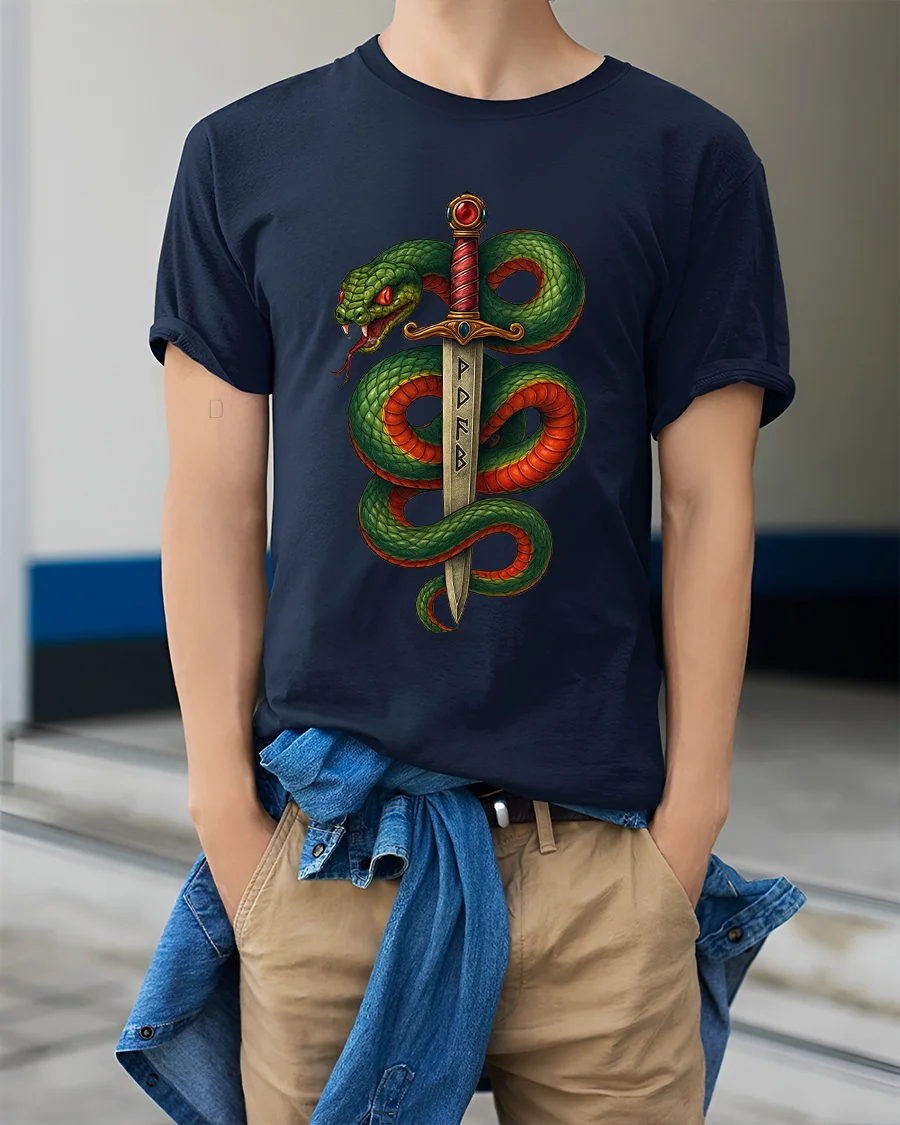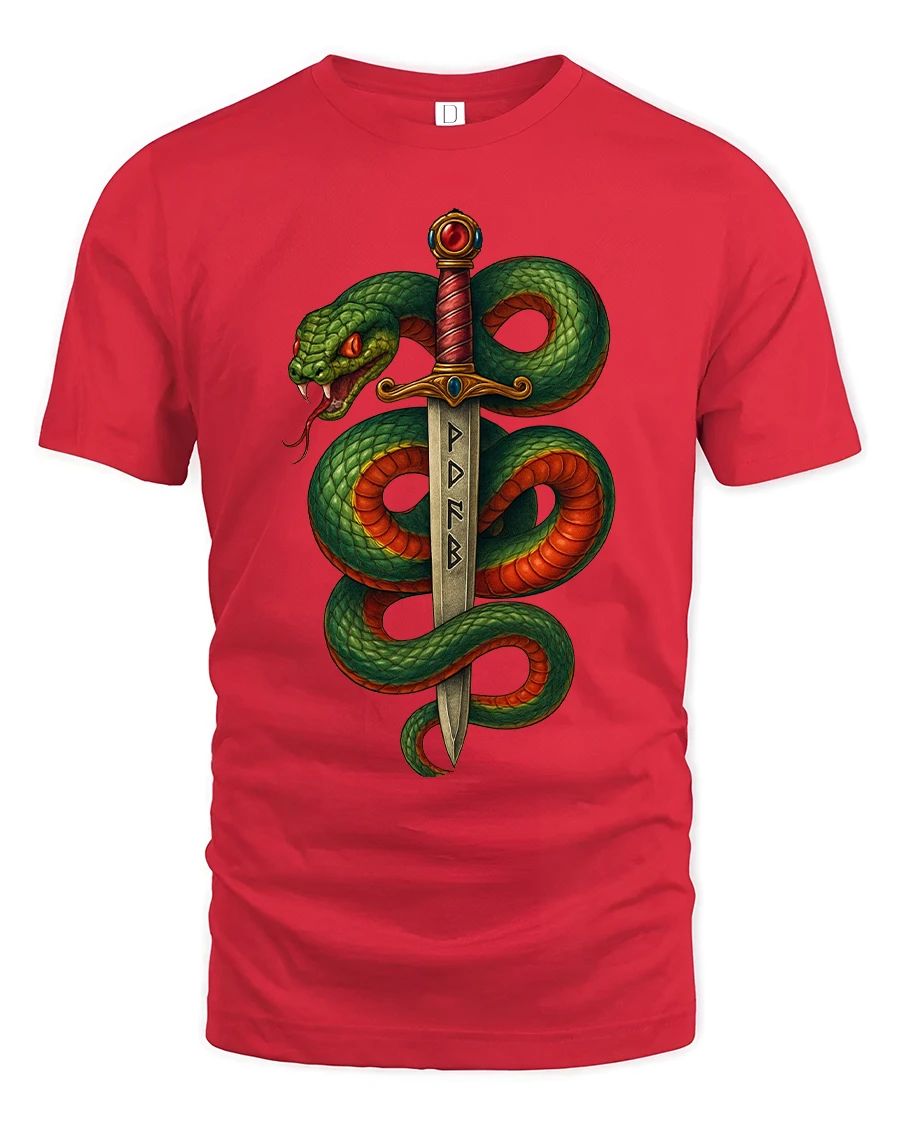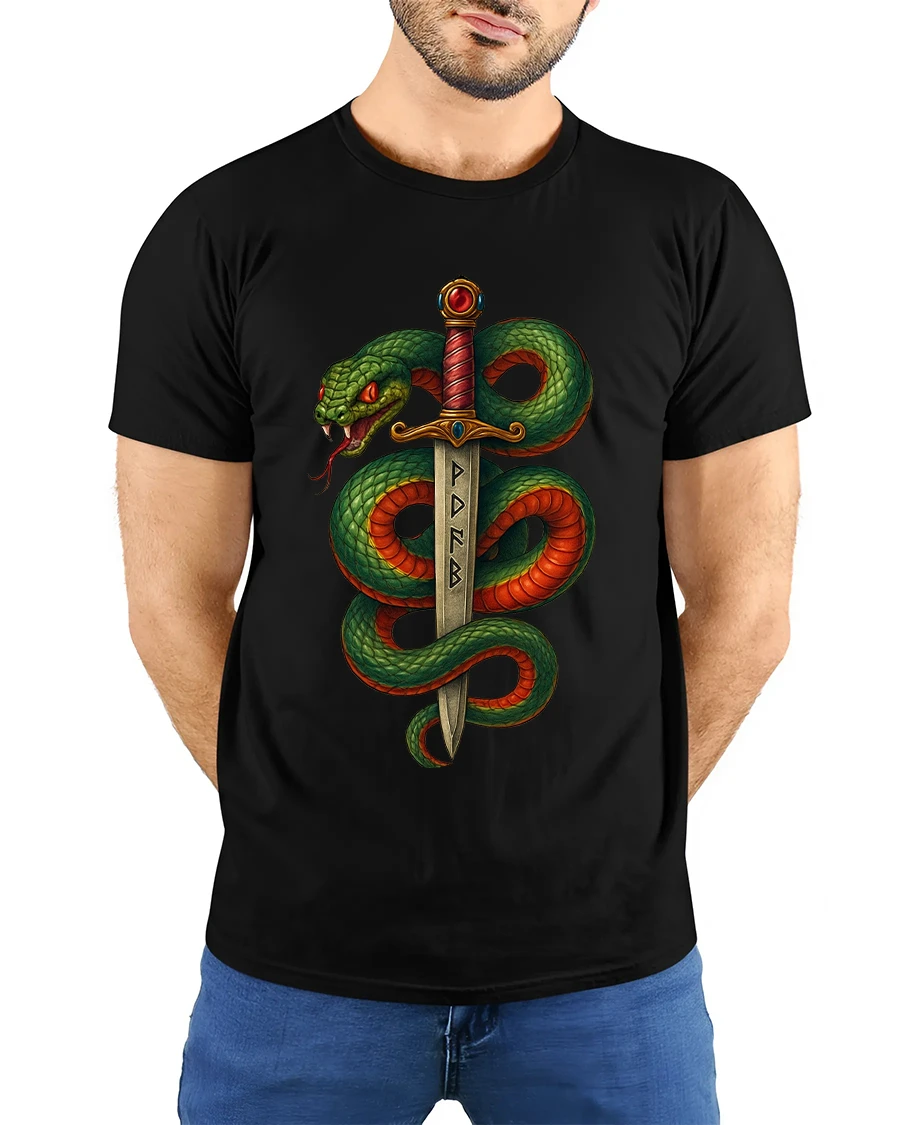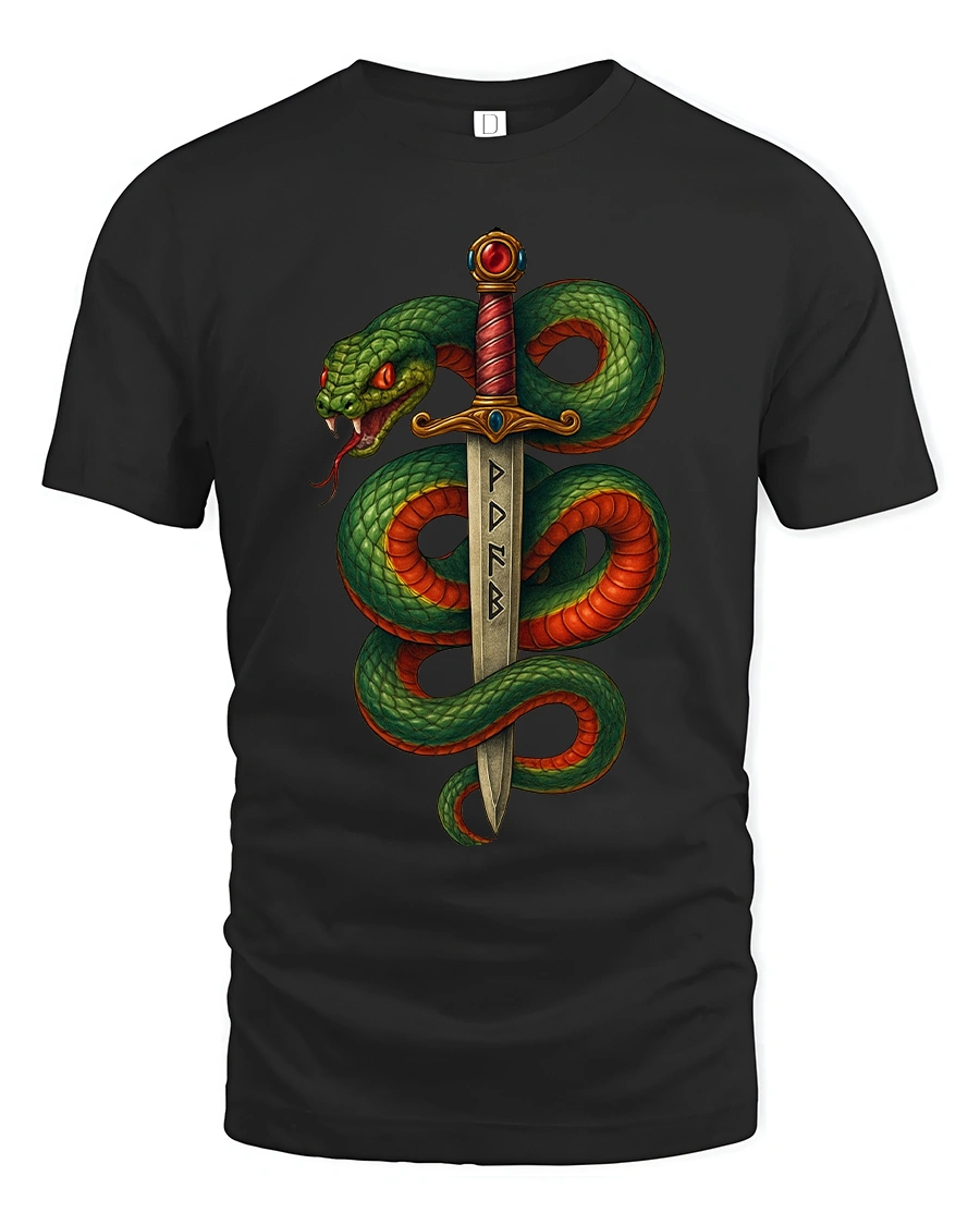 Mythic Serpent Sword Rune Art Graphic Tshirt Dark Fantasy Power is ideal for fans of fantasy mythology and symbolic art.