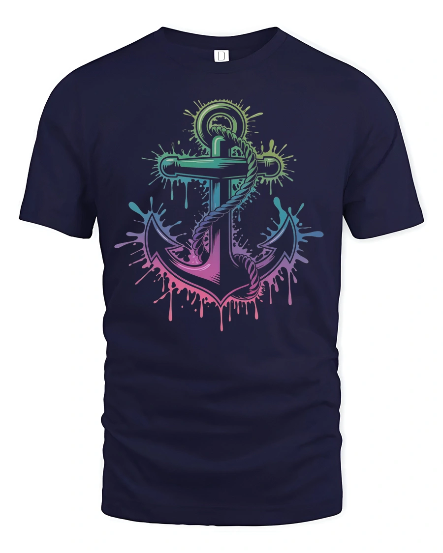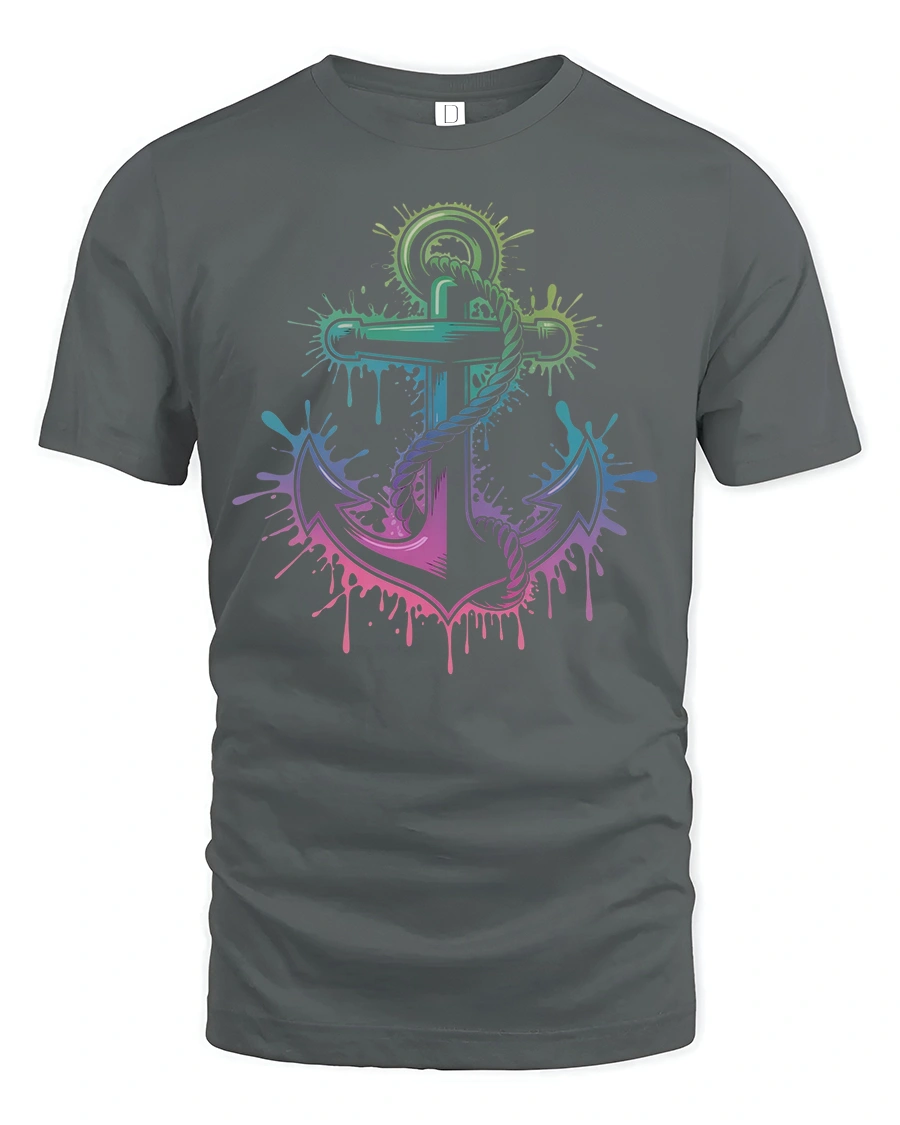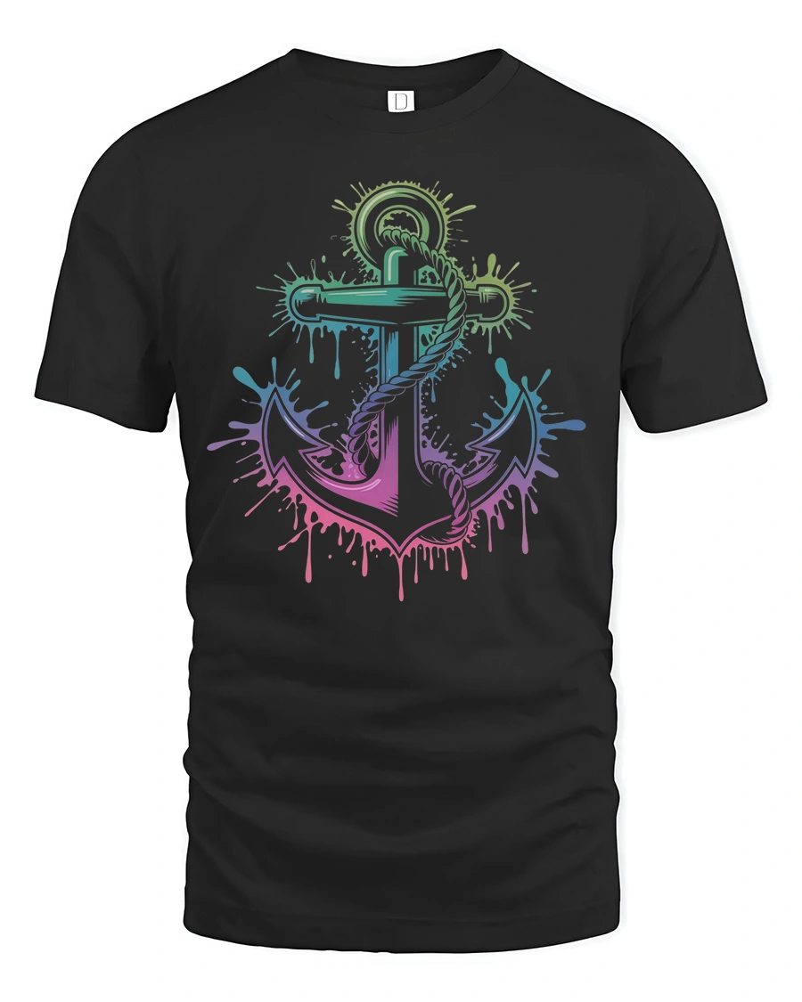Featuring a vibrant gradient anchor surrounded by colorful paint splashes, this tee captures the adventurous spirit of the sea with a fun and modern twist.