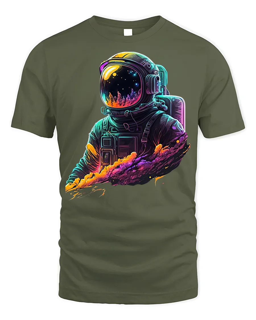 Neon Cosmic Astronaut Galaxy Drip T-shirt - military green t-shirt on white background