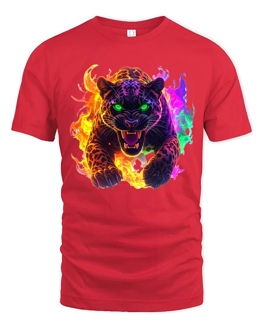 Tags: bold graphic tshirt, colorful panther t shirt, fantasy animal tshirt, fierce animal tshirt, fire panther graphic tee, flaming leopard shirt, glowing panther shirt, modern wildlife graphic tee, neon animal tshirt, panther tshirt, powerful animal art tshirt, psychedelic animal tee, statement graphic tee, streetwear animal tee, wild cat graphic tee