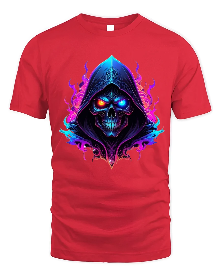 The Neon Hooded Skull Graphic T Shirt delivers a powerful mix of dark fantasy and vibrant neon energy.