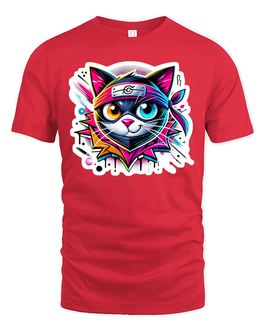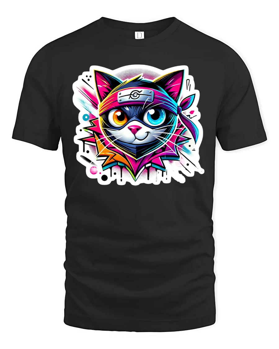 Unleash your inner warrior with the Neon Ninja Cat Warrior Graphic Anime Style T-Shirt. This bold tee features a vibrant cat character styled as a fearless ninja, complete with glowing eyes, a headband, and colorful graffiti-like details. It’s the perfect mix of anime energy, streetwear style, and playful humor, making it a must-have for fans of unique graphic tees.