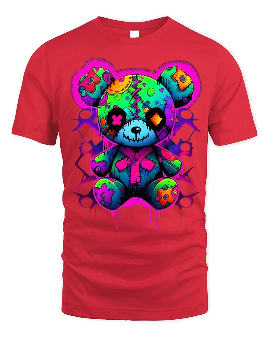 This quirky tee features a brightly colored teddy bear with a unique patchwork design, stitched details, and neon accents in pink and purple.