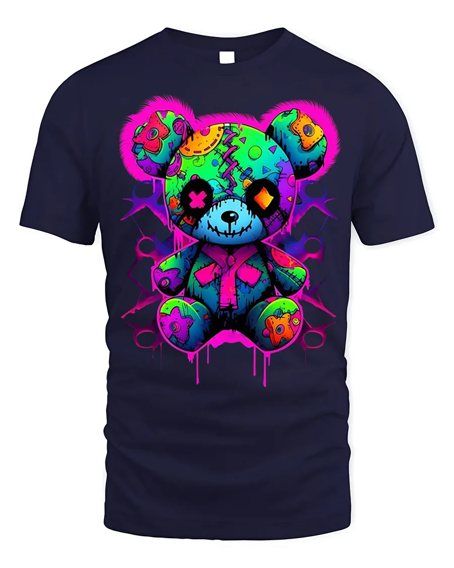 Tags: alternative bear tee, colorful bear design, comfortable t-shirt, creepy cute tee, cute goth shirt, edgy cute t-shirt, fun graphic tee, kawaii goth shirt, men's novelty shirt, neon bear tee, patchwork bear shirt, statement animal tee, Teddy bear t-shirt, unique animal shirt, women's quirky tee