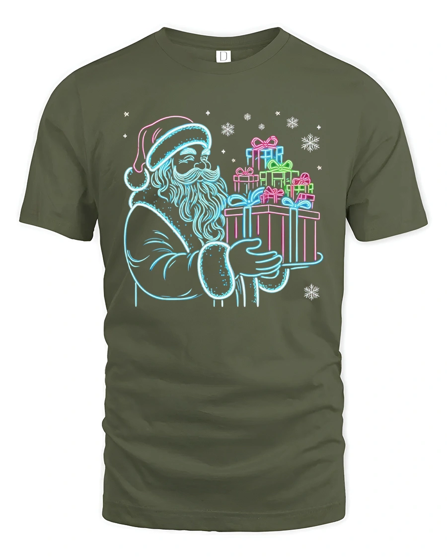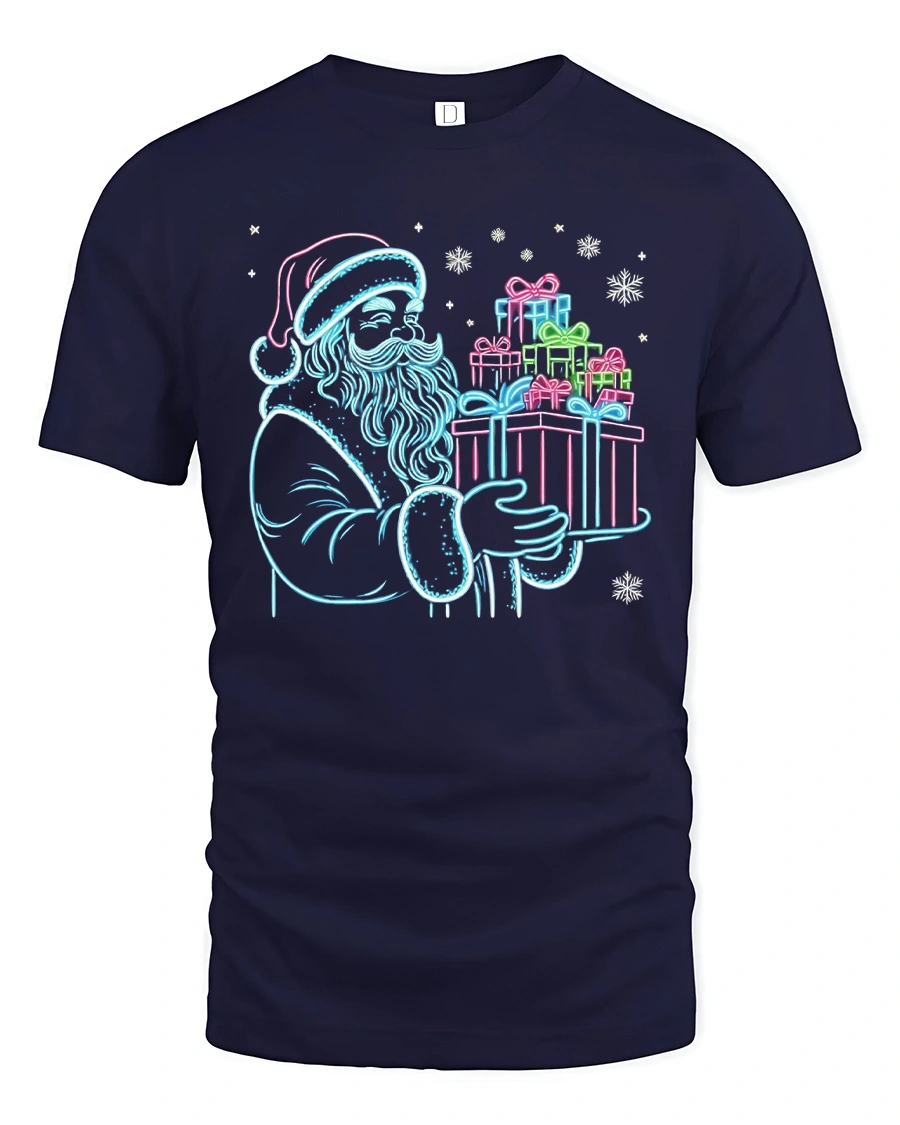 Light up the holiday season with this eye catching neon santa t shirt featuring a bold glowing Santa Claus design holding colorful Christmas gifts.