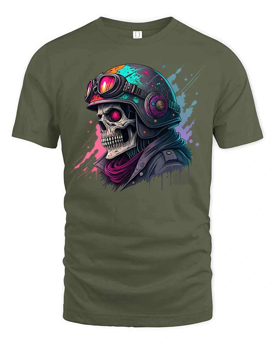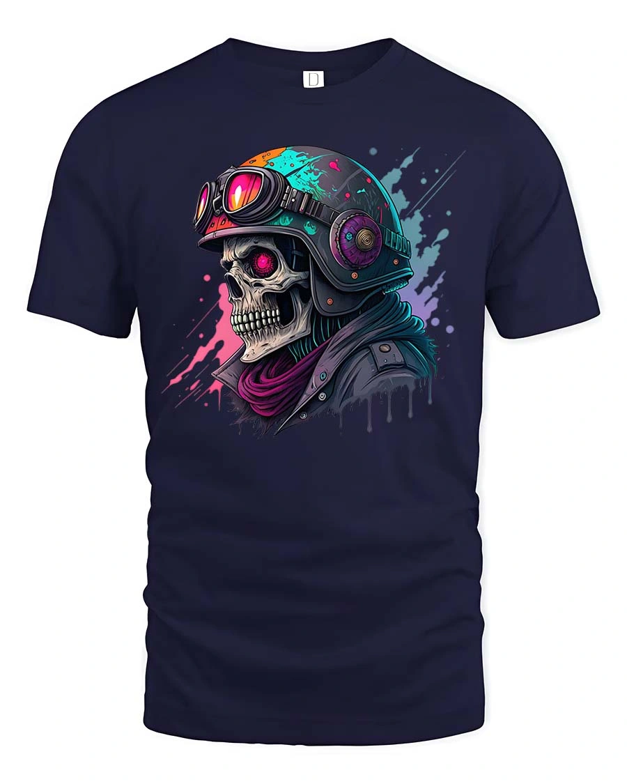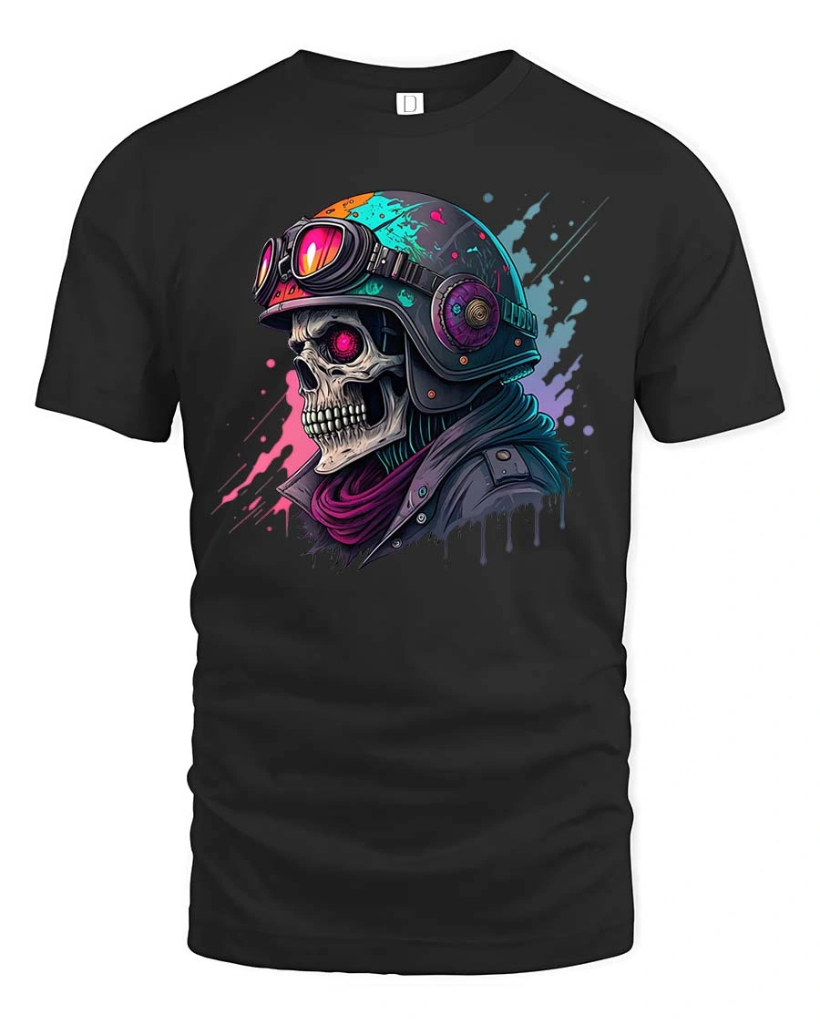 Neon Skull Biker Graphic T-Shirt is a bold and electrifying design made for fans of edgy streetwear and dark art. Featuring a detailed skull wearing a biker helmet with vibrant neon accents, this skull biker t-shirt instantly commands attention. The glowing colors and paint-splatter effects create a striking cyberpunk vibe that stands out against the dark background.