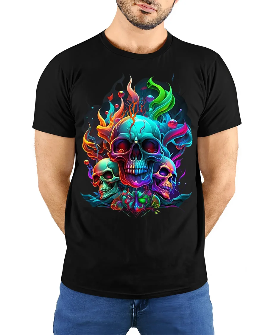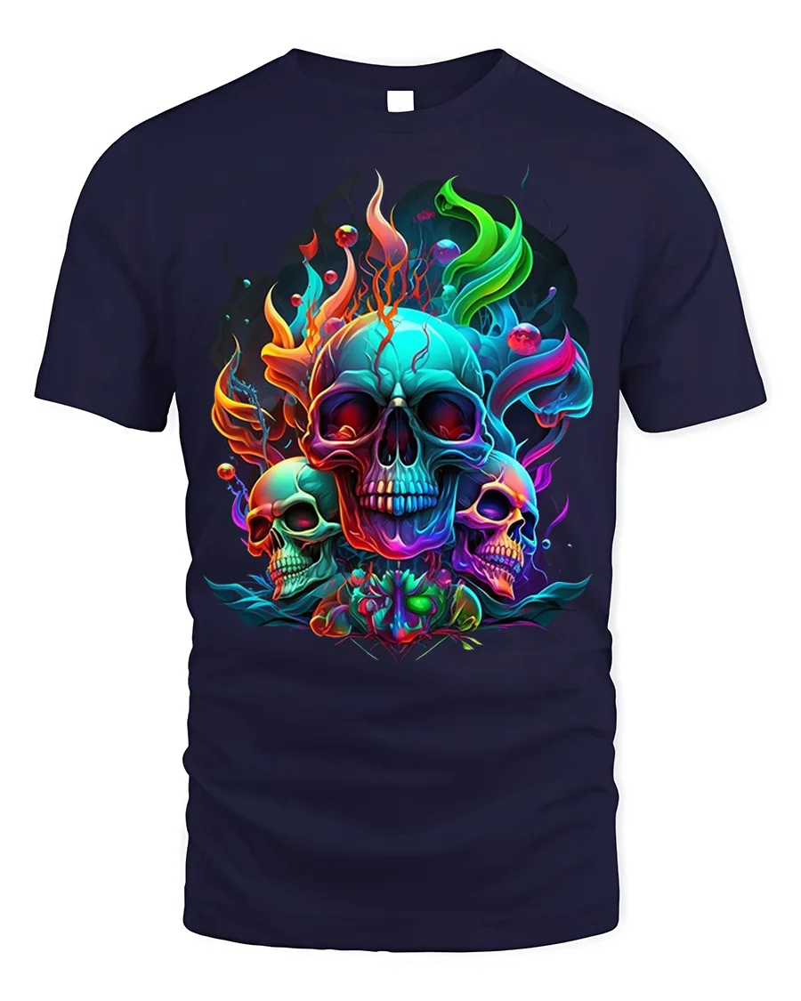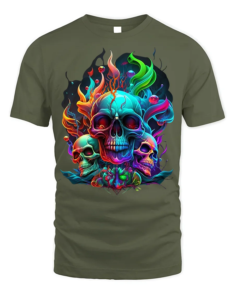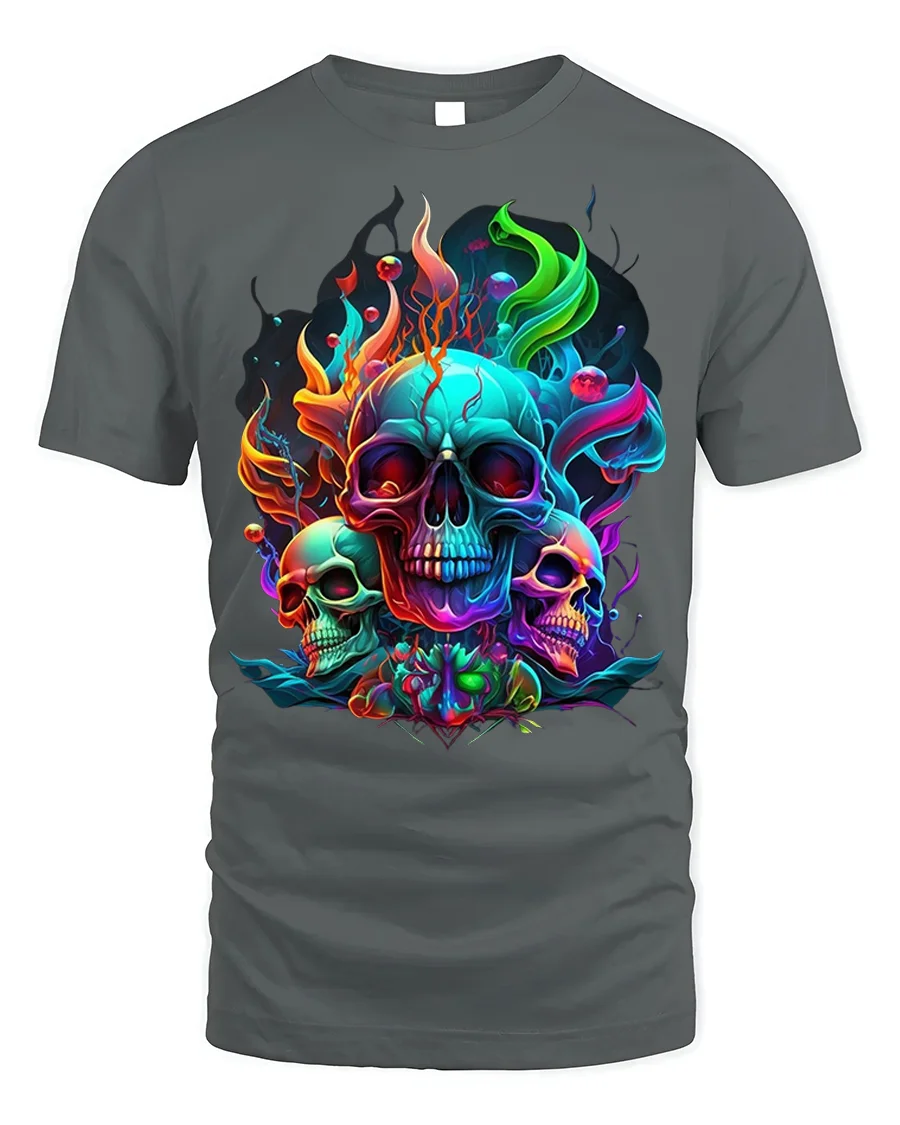 Unleash your bold style with our Neon Skull Tee – Vibrant Skulls T-Shirt. This striking design features a captivating cluster of skulls rendered in brilliant, glowing neon colors with fiery accents. It’s a truly unique and eye-catching piece that combines dark aesthetics with vibrant artistry.