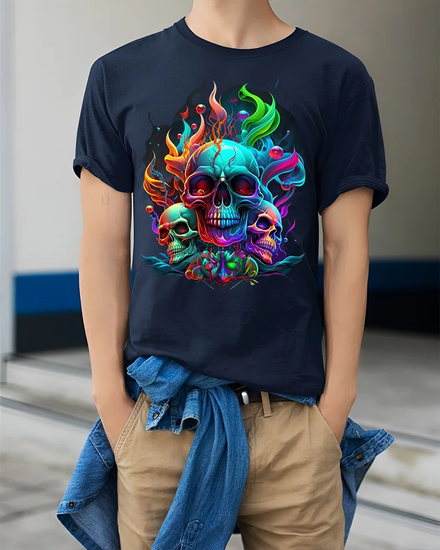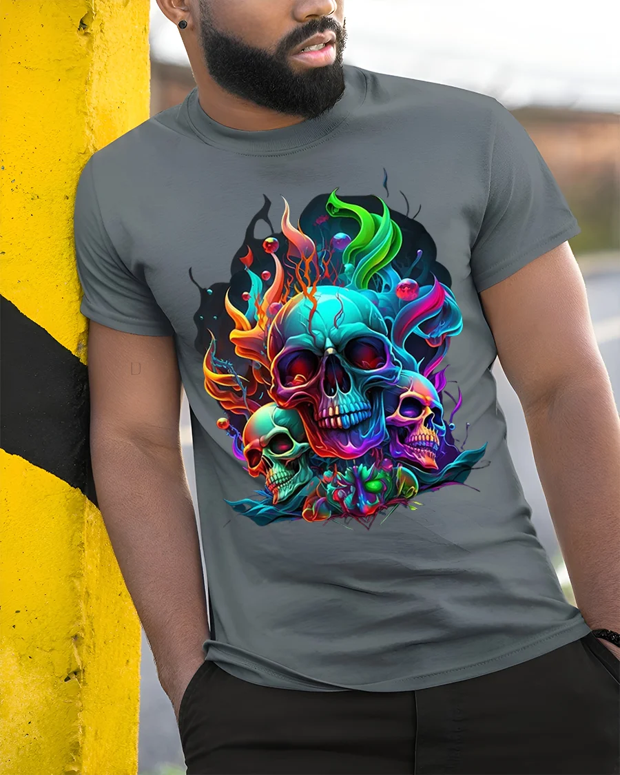 Crafted from soft, comfortable cotton, this t-shirt offers an excellent feel for everyday wear. The high-quality print ensures that the intense neon hues and intricate details of the skulls remain vivid and sharp, even after many washes. It’s more than just a t-shirt; it’s a statement of individuality and edgy flair.