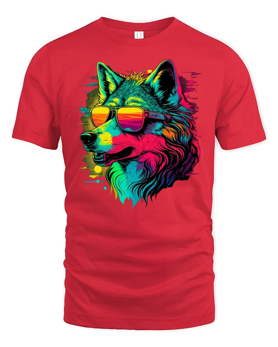Neon Wolf Sunglasses Tee - red t-shirt on white background