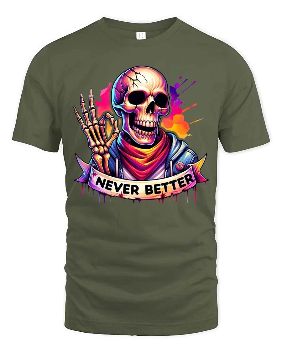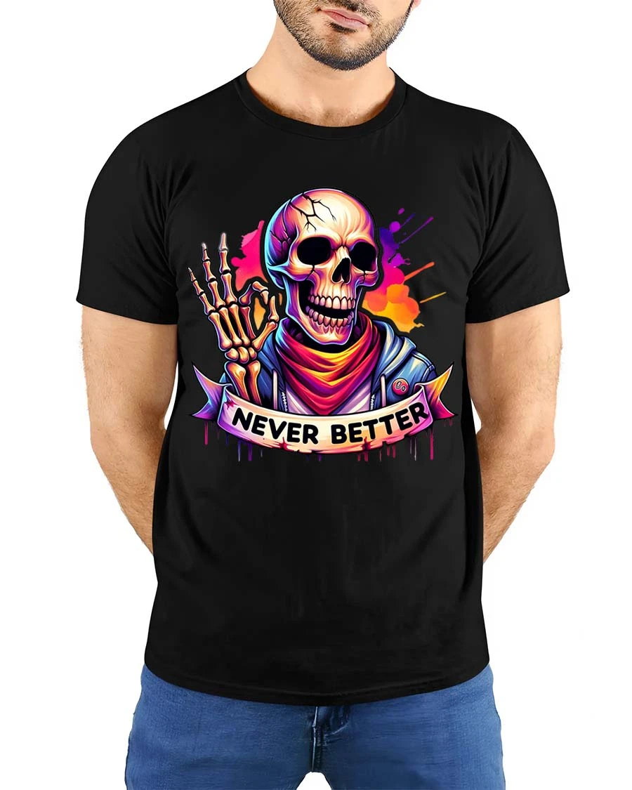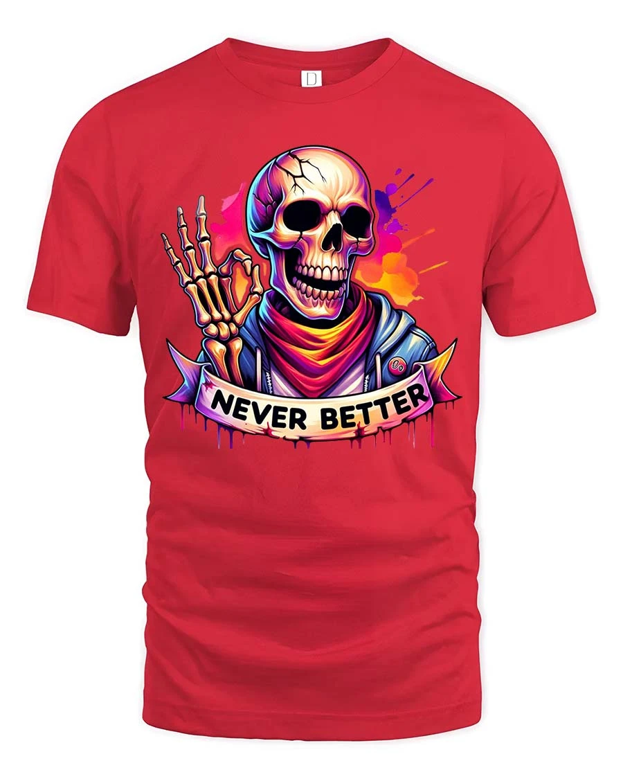 Make a bold impression with this never better skull t-shirt featuring a vibrant and edgy streetwear design.