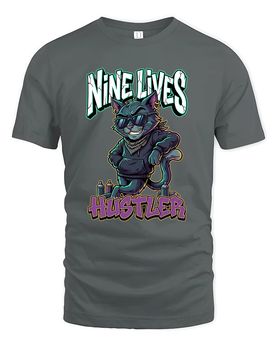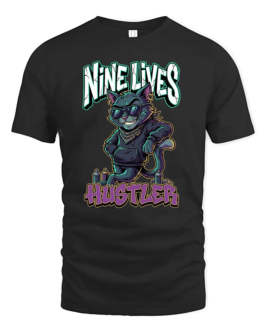 Show off bold street attitude with the Nine Lives Hustler Cool Cat Graphic T Shirt. This eye catching design features a confident cartoon cat rocking sunglasses and urban style while surrounded by graffiti inspired details. The nine lives hustler t shirt blends playful feline charm with edgy streetwear vibes, making it a standout addition to any casual collection.