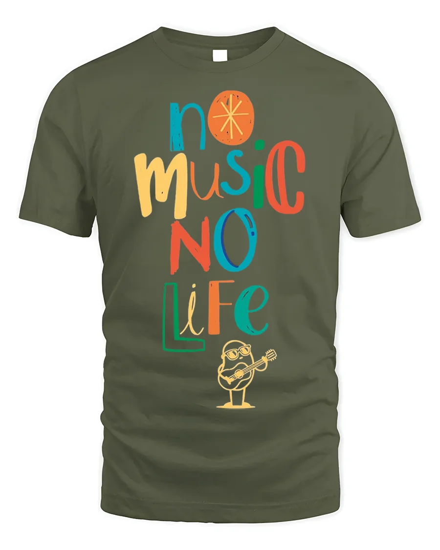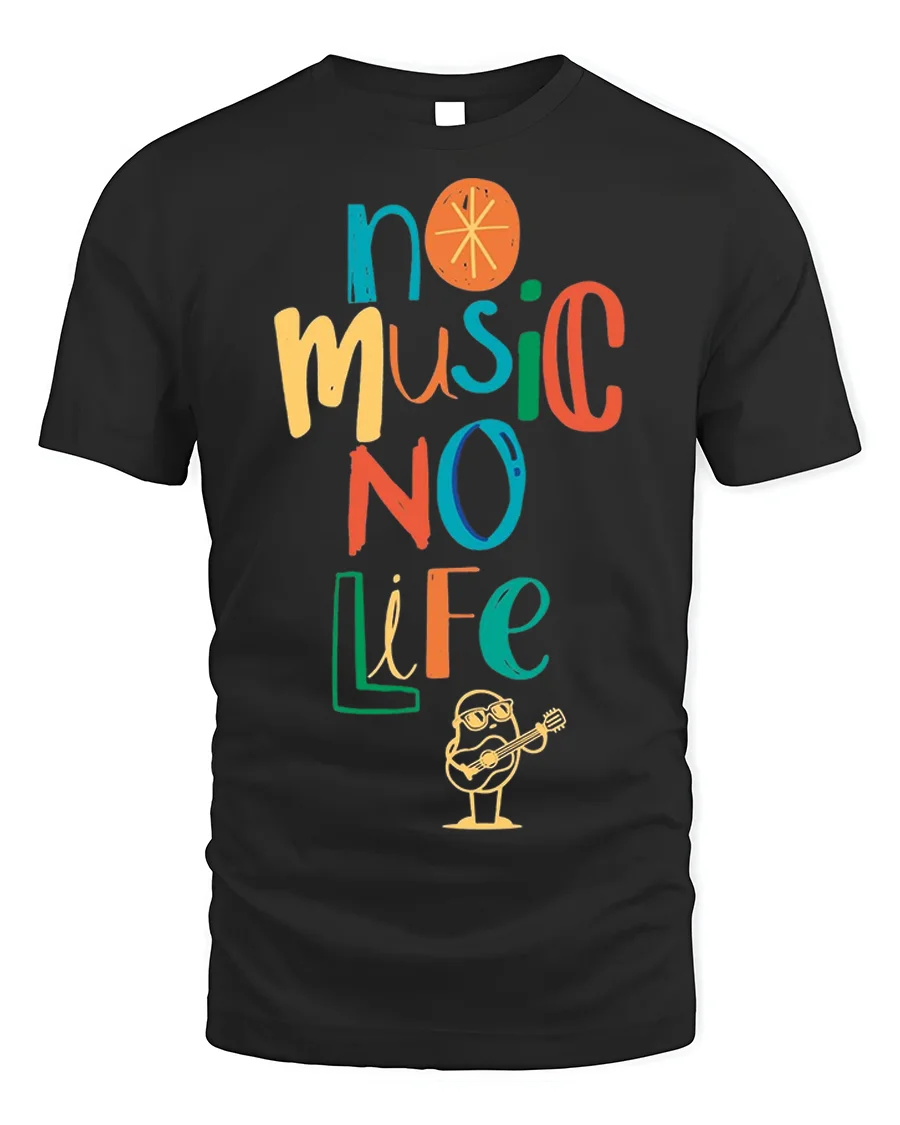 This fun, vibrant design features the bold phrase “No Music No Life” in a playful, multicolor font, complemented by a cute cartoon figure strumming a guitar.