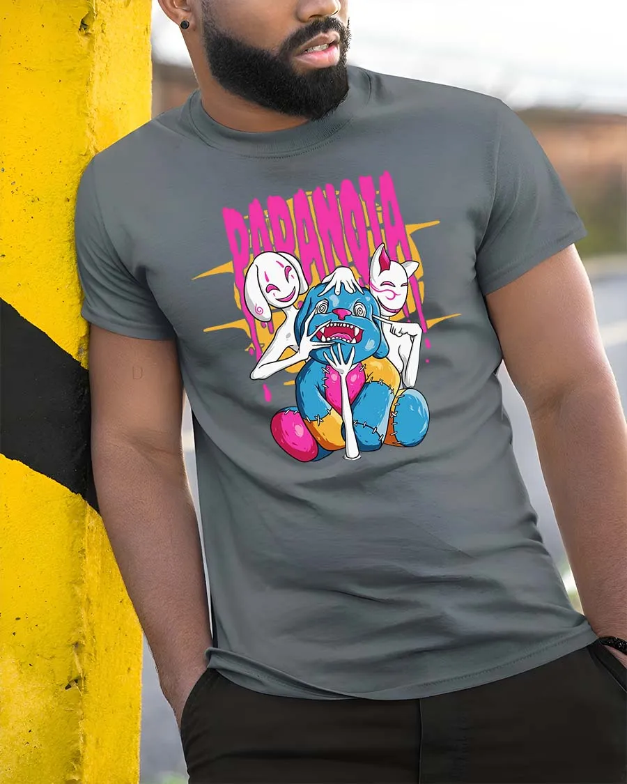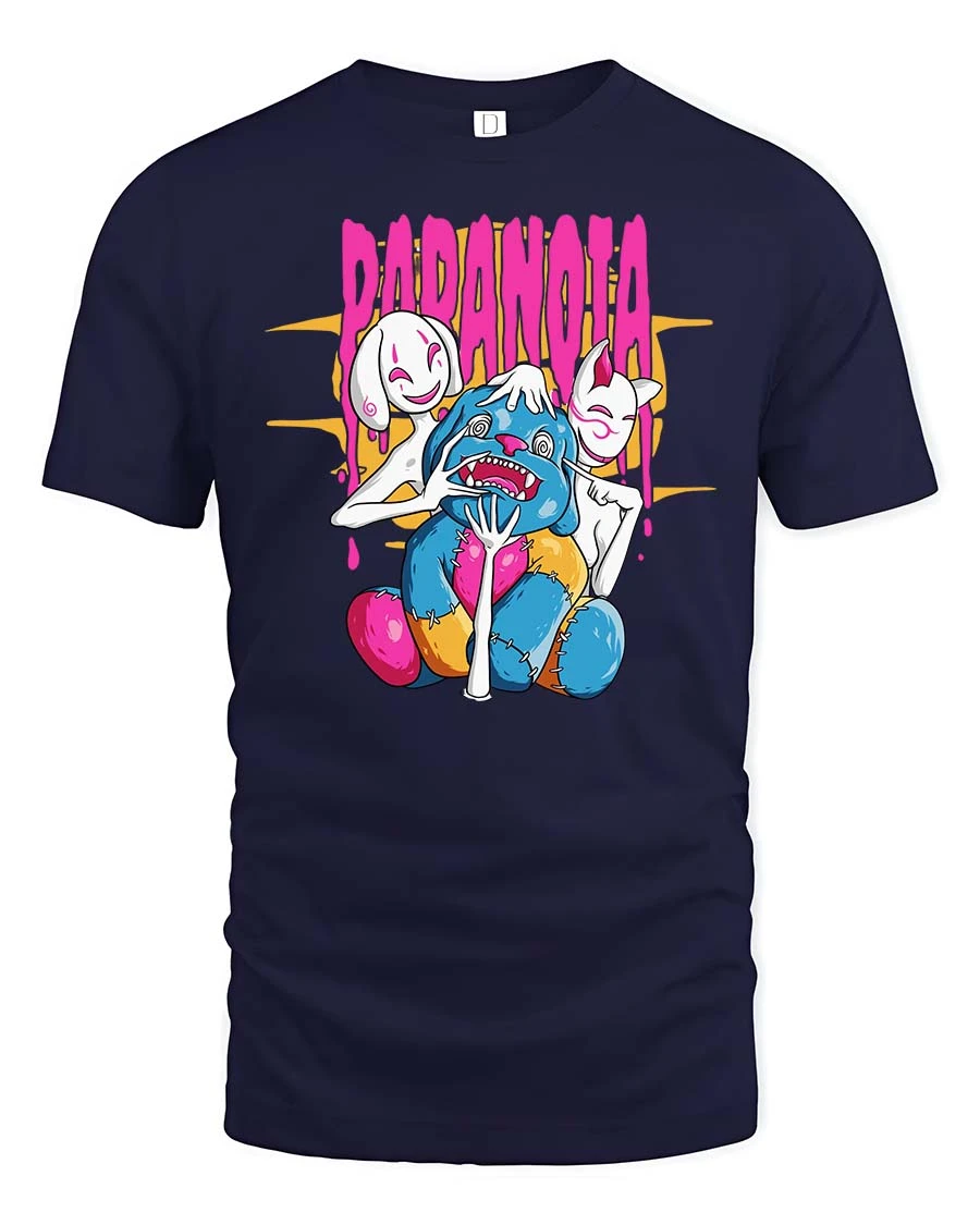 Paranoia Creepy Doll Mask Horror Dark Humor Graphic Tshirt features a bold and expressive design inspired by eerie imagination and dark artistic themes.