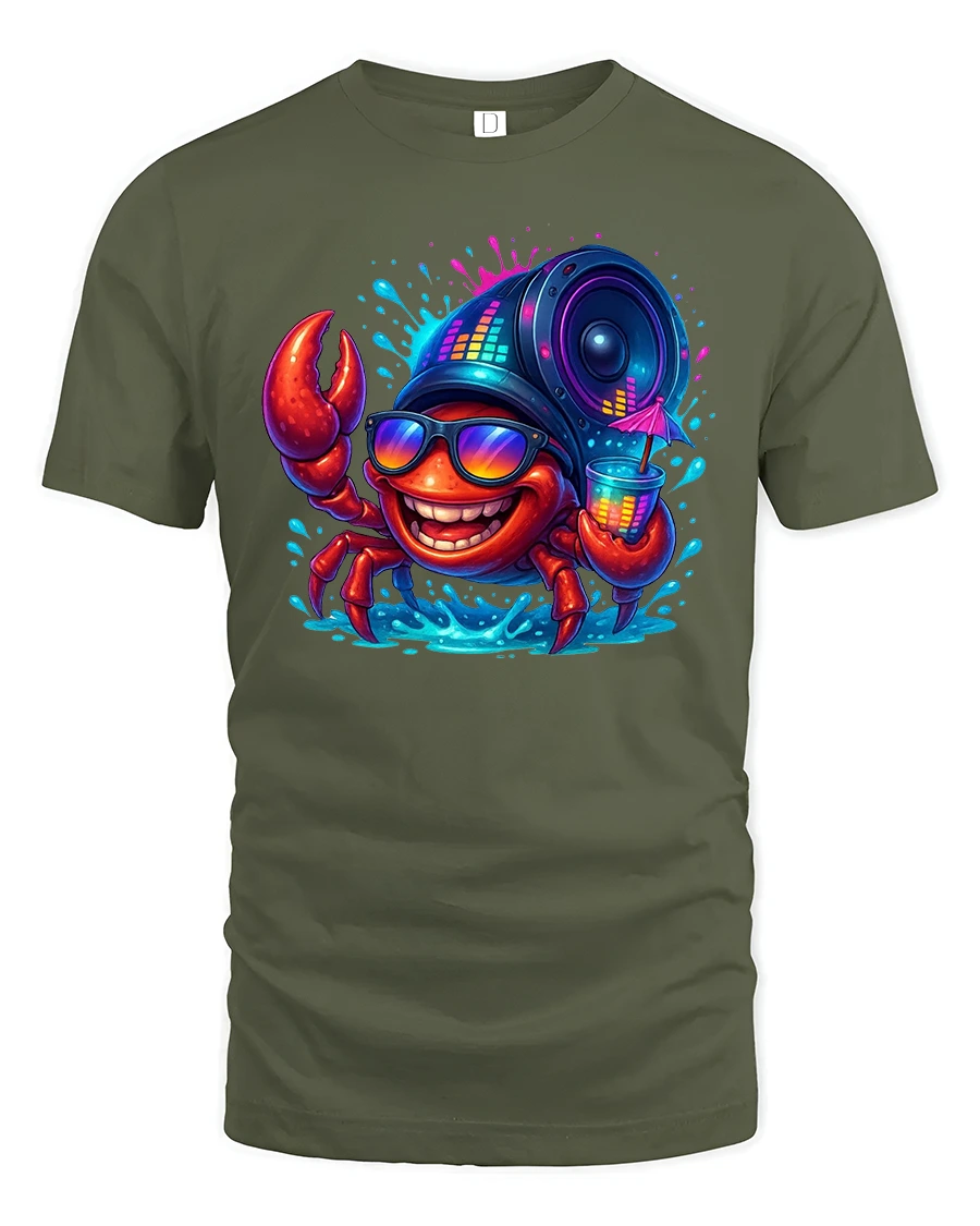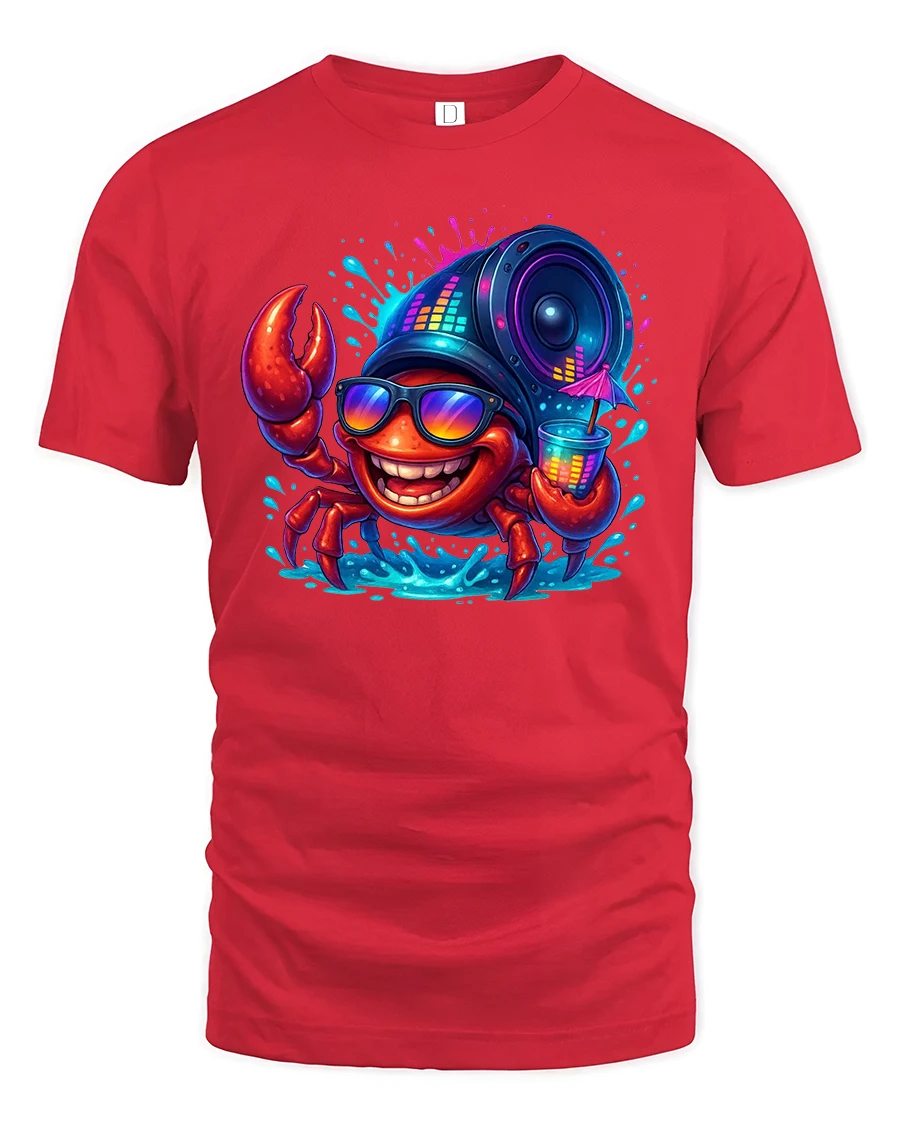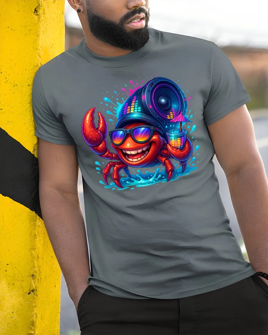 Featuring a cheerful crab rocking sunglasses, sipping a cocktail, and carrying a giant speaker on its shell, this design explodes with color and positive energy.