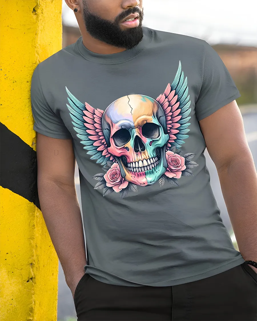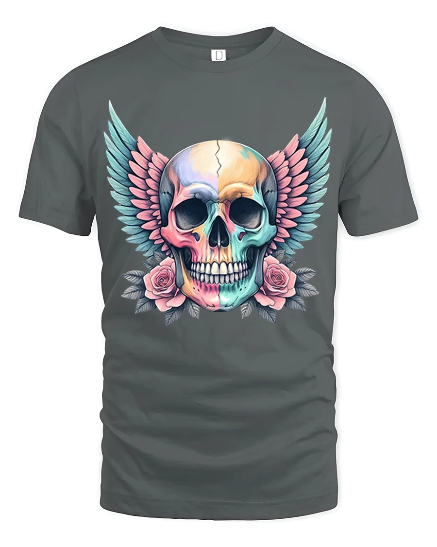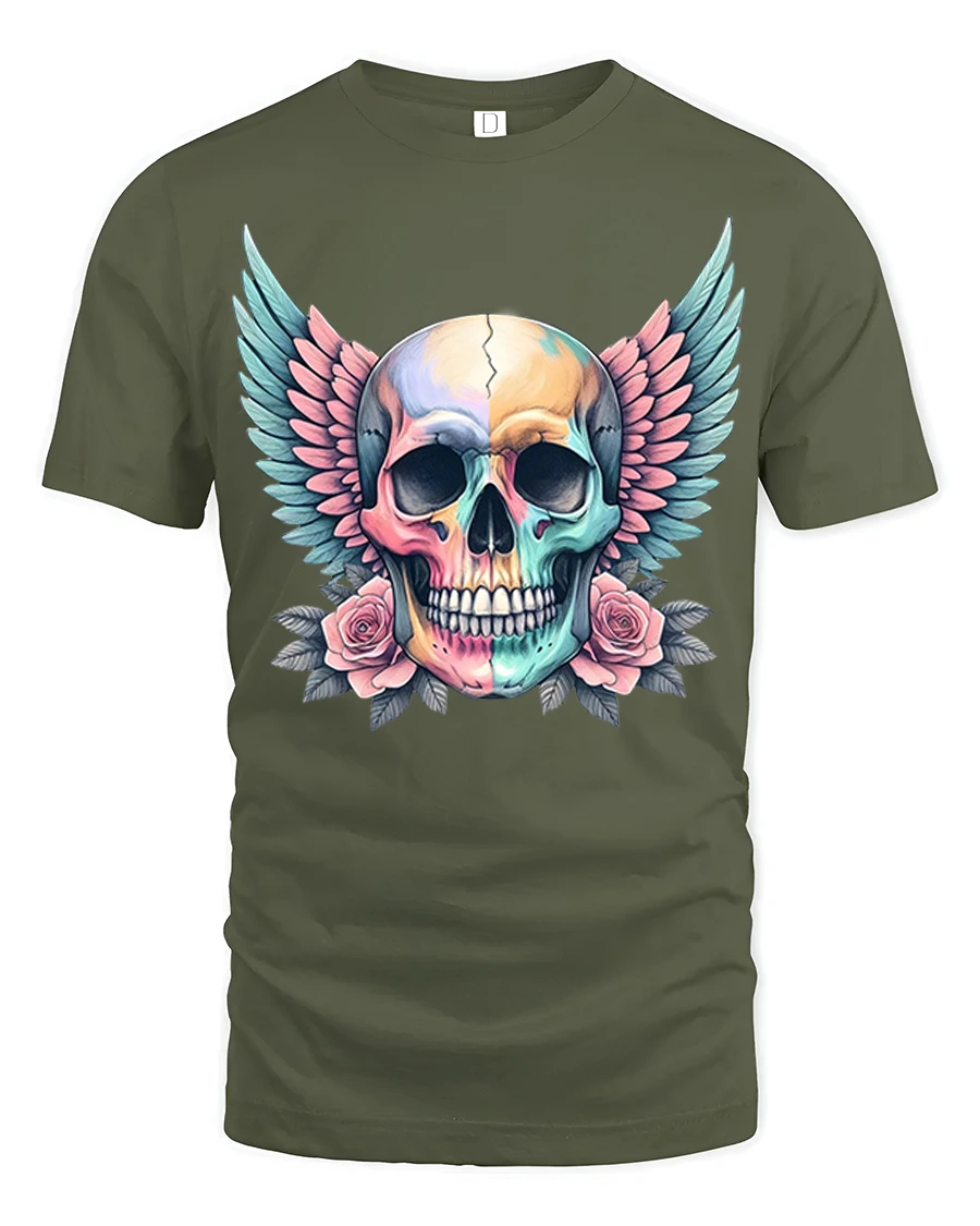 The design brings together symbolic elements of strength, transformation and artistic expression. The wings and roses soften the classic skull look, giving the tee a refreshing balance of gothic and whimsical aesthetics. It’s perfect for individuals who enjoy expressive artwork that mixes dark motifs with bright colors. The combination of floral accents and winged imagery adds depth and personality, making the tee ideal for everyday wear or special events where bold style is celebrated.