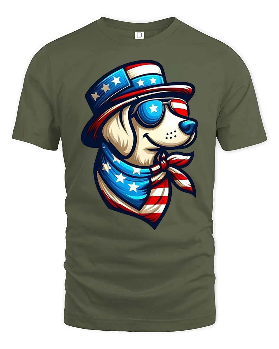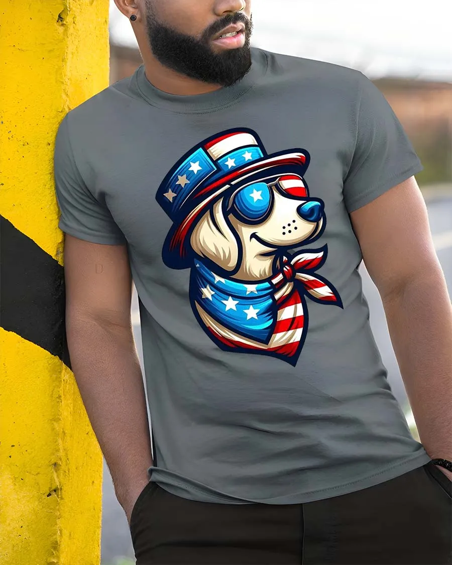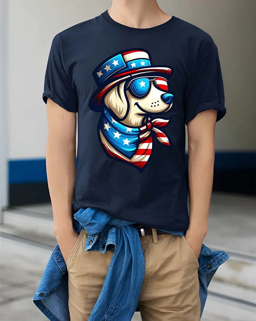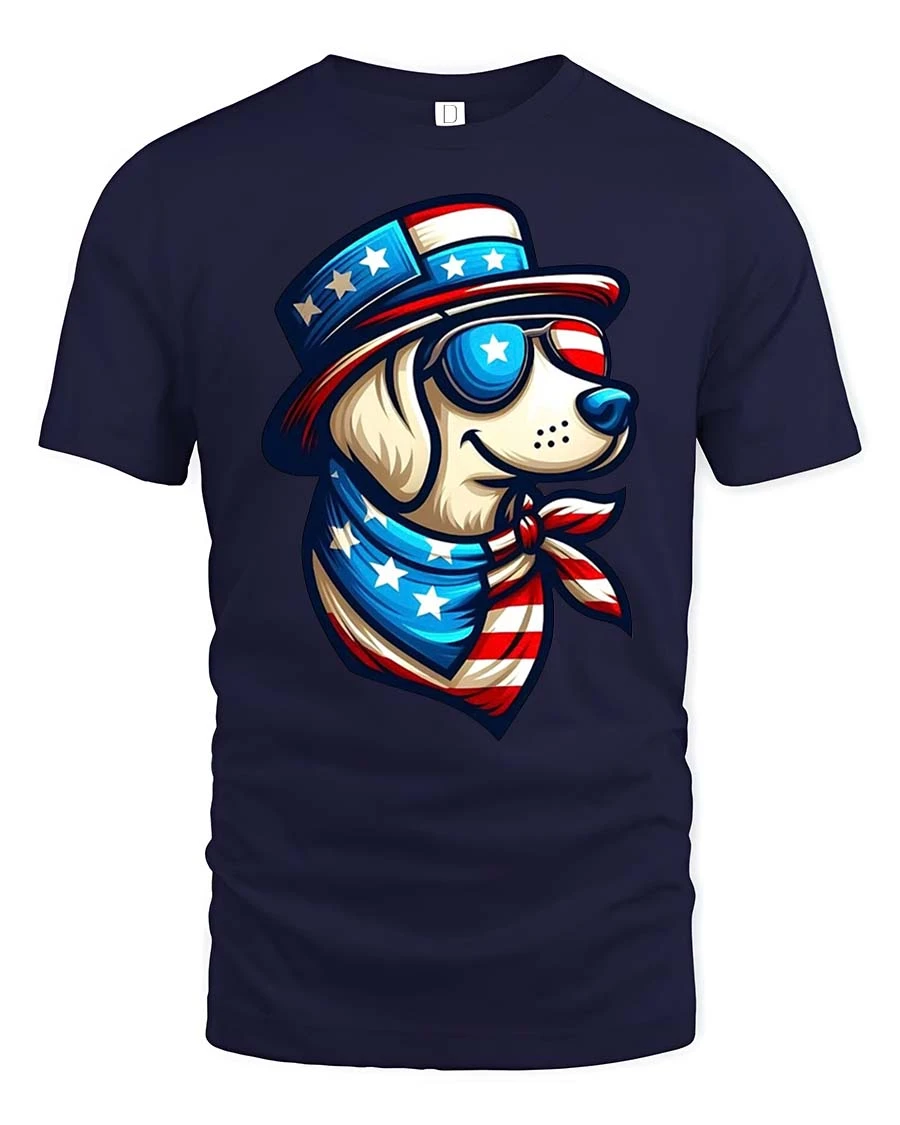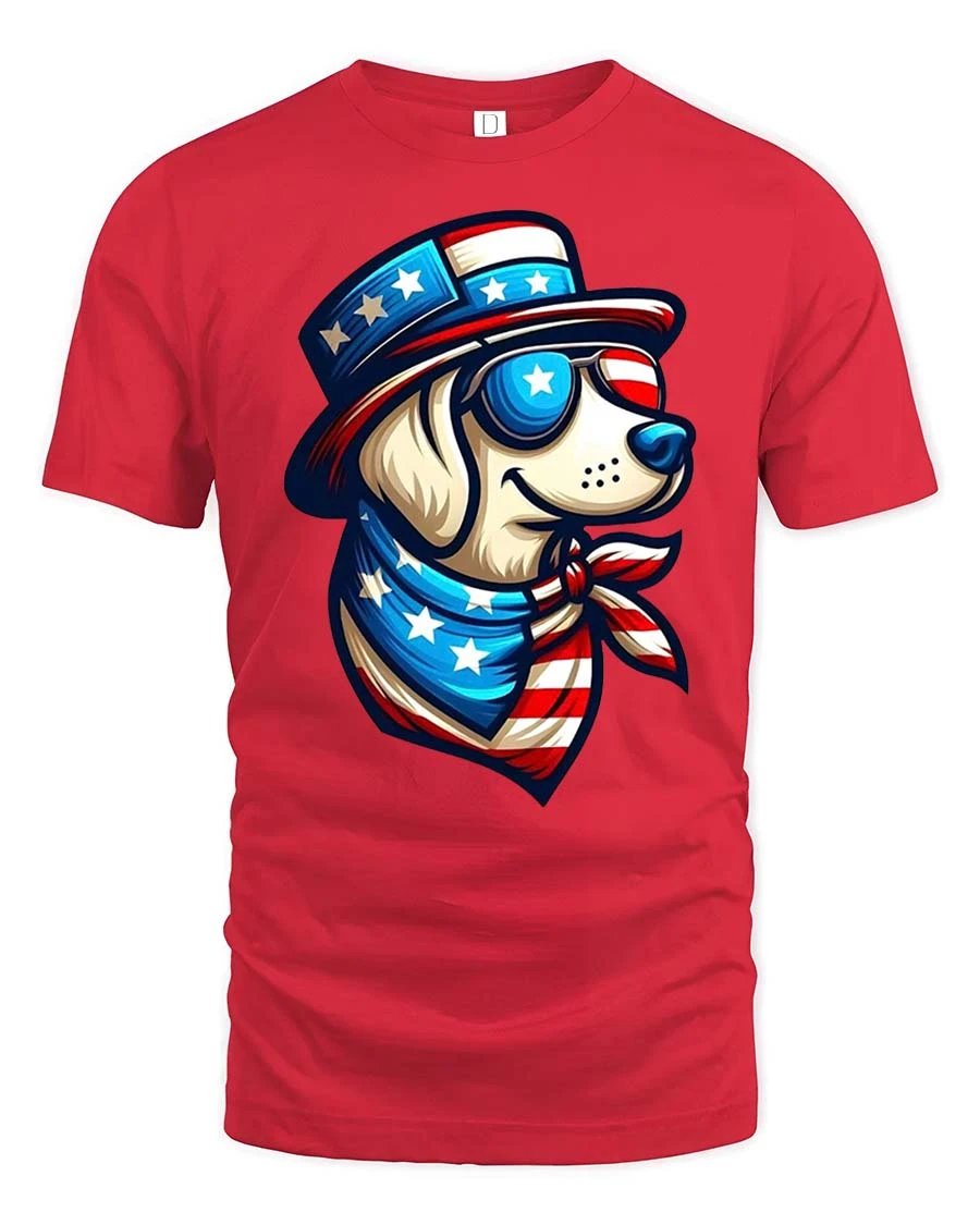 The vibrant patriotic theme makes this design perfect for Independence Day celebrations, summer gatherings, barbecues, or casual everyday wear. The cheerful dog graphic adds personality and a festive vibe that stands out in any crowd.