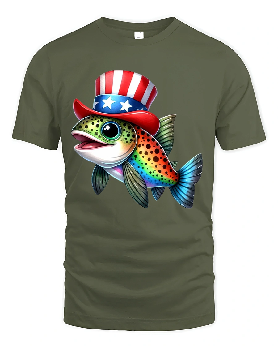 Patriotic Fish Graphic Tee Funny Uncle Sam Style Art - military green t-shirt on white background