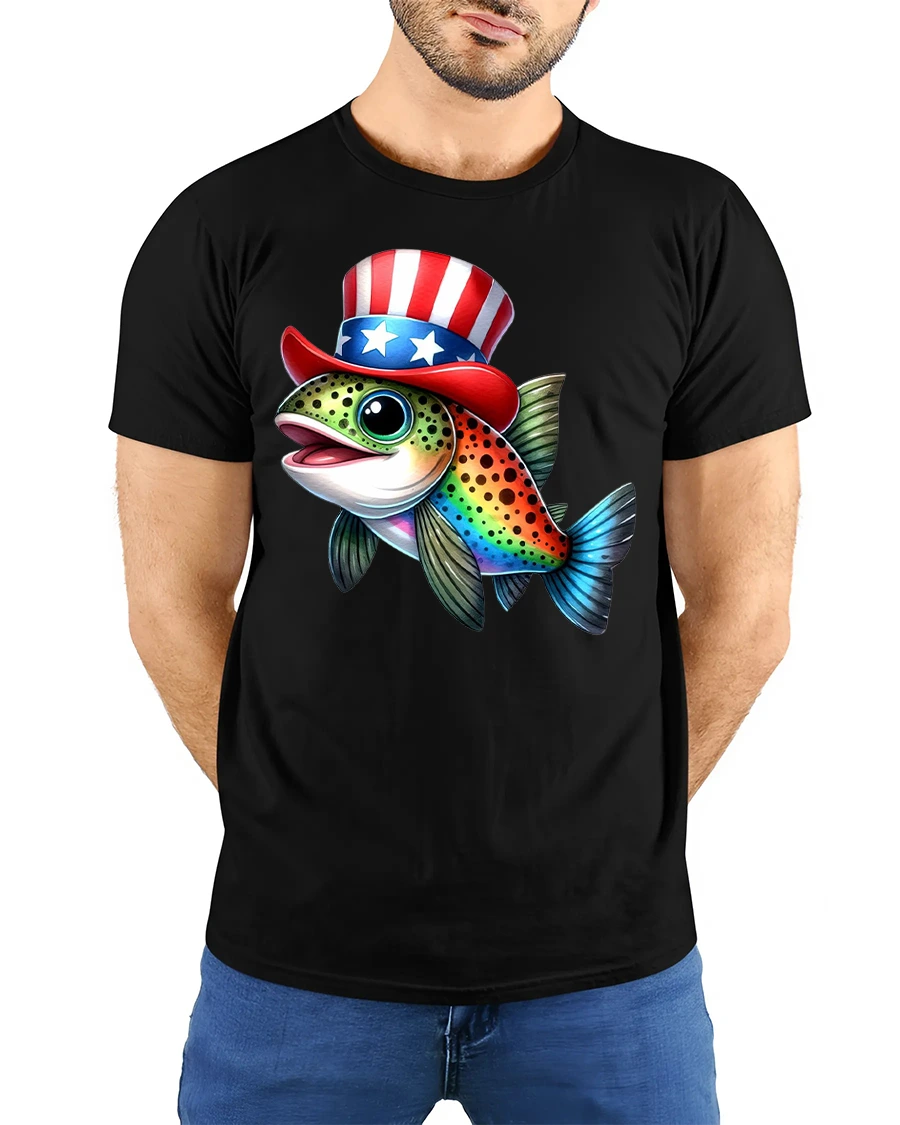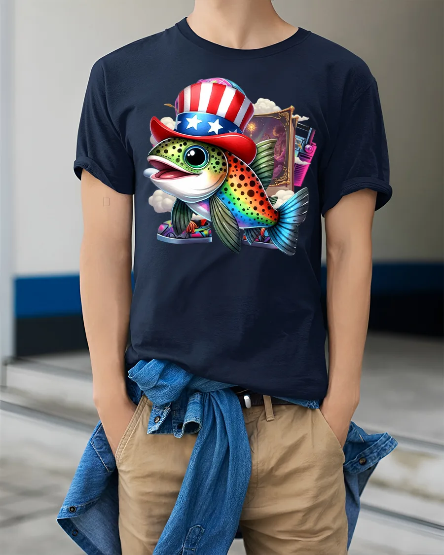 Patriotic Fish Graphic Tee delivers a playful twist on classic American style with a colorful fish wearing a bold stars and stripes hat.