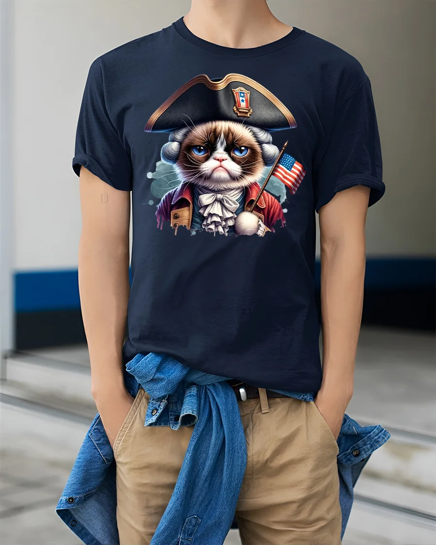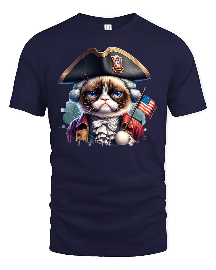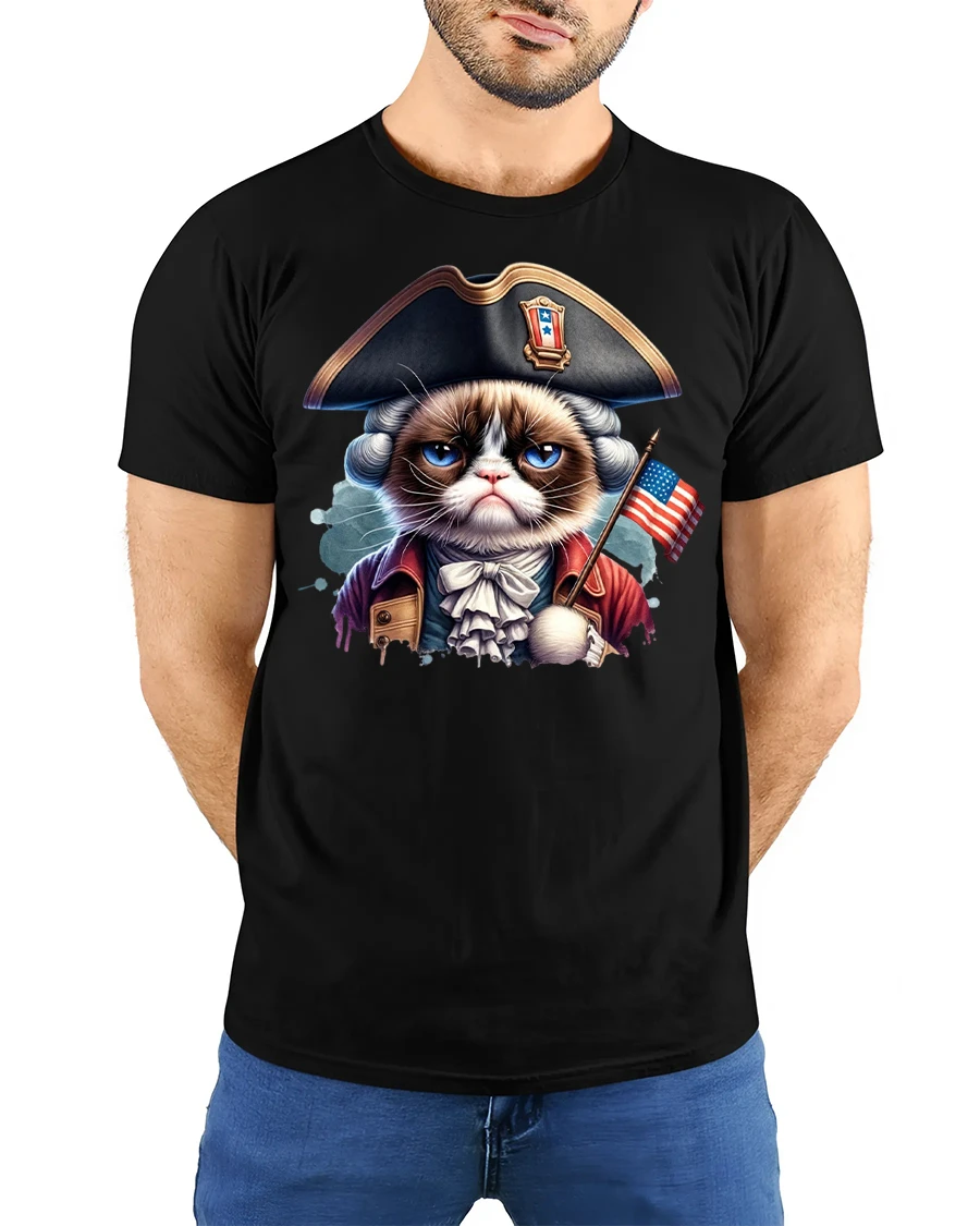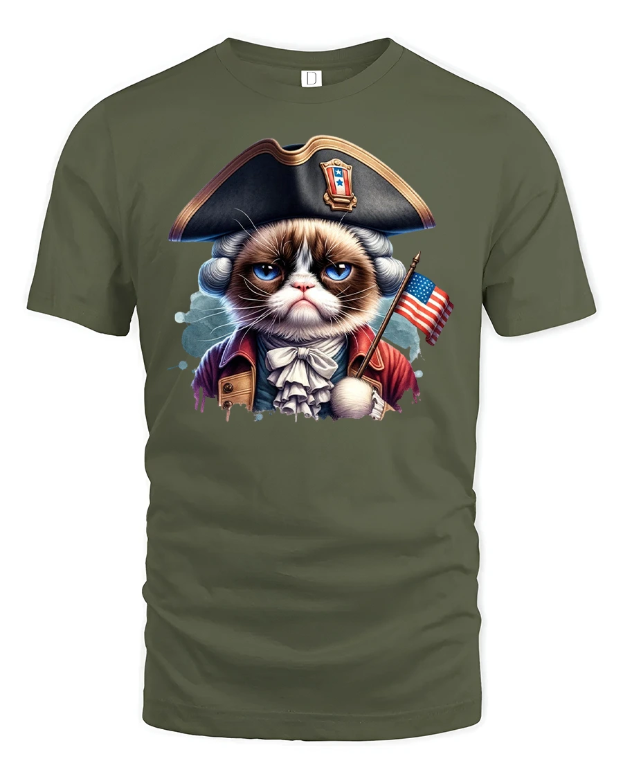 Featuring a stern-faced cat dressed like a colonial patriot and holding the American flag, this design is ideal for celebrating Independence Day with a playful twist.