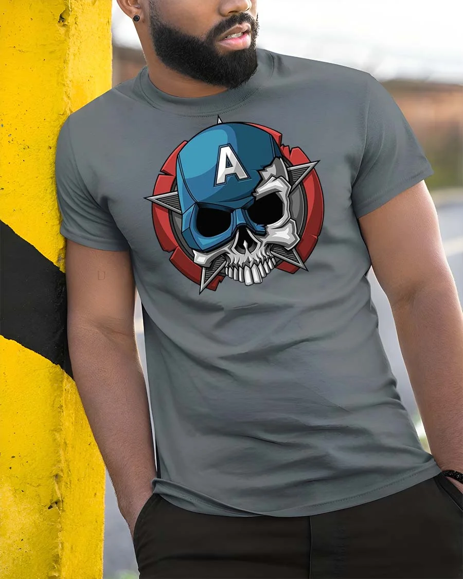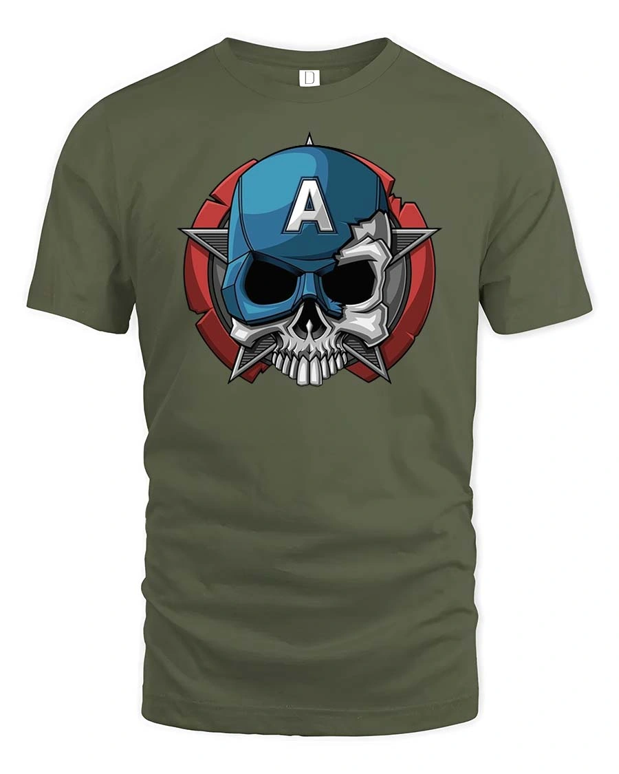 Patriotic Skull Shield Graphic T-Shirt delivers a bold fusion of strength and iconic hero-inspired design. Featuring a detailed skull combined with a shield emblem and striking red and blue tones, this patriotic skull t-shirt creates a powerful statement look. The sharp lines and dynamic composition give it a comic-book energy that stands out on any casual outfit.