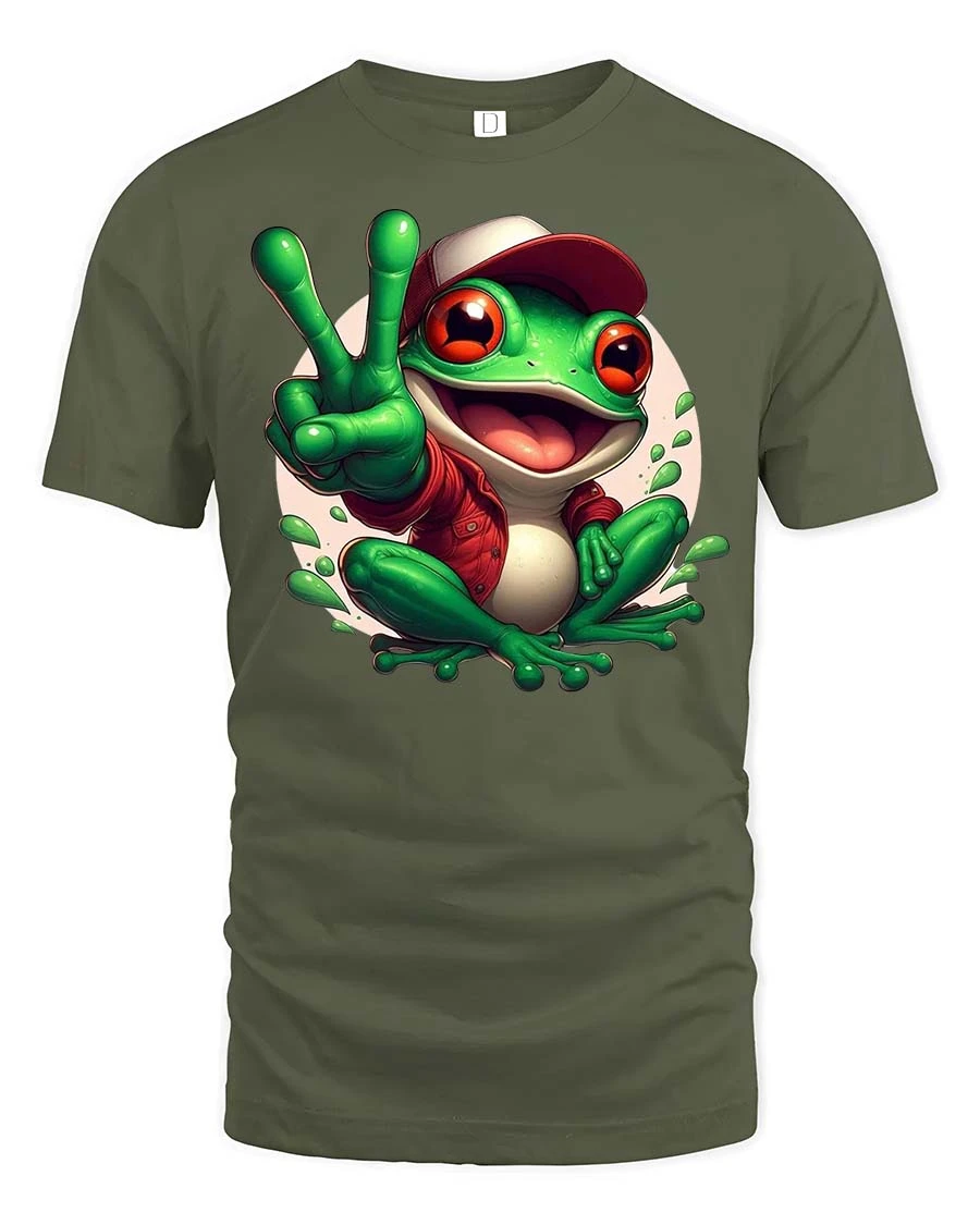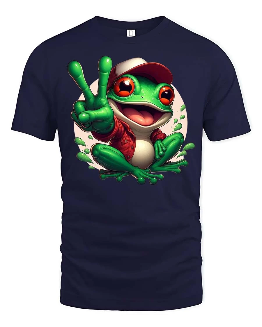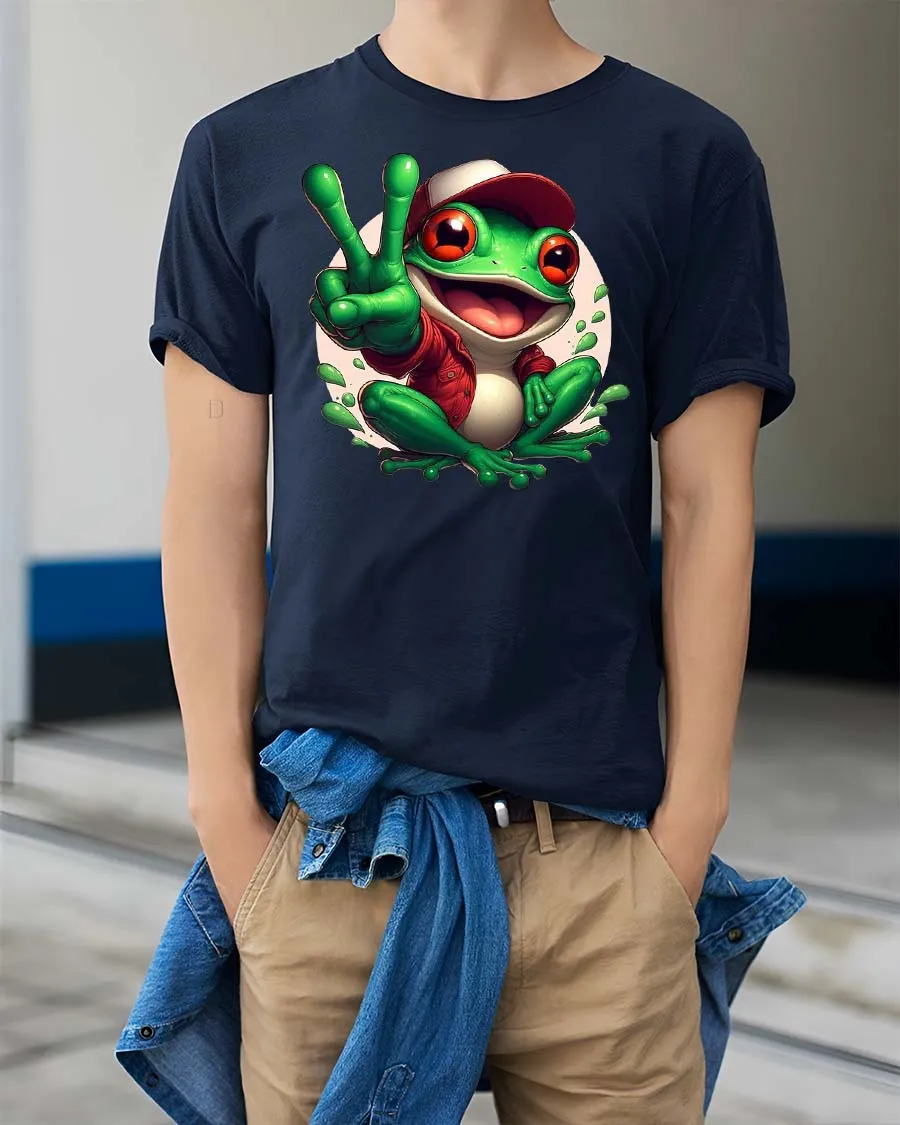 The Peace Frog Cartoon T-Shirt features a cheerful amphibian character flashing a playful peace sign, creating a fun and energetic graphic design that instantly stands out. The bright cartoon frog with its big expressive eyes and relaxed vibe gives the shirt a lighthearted personality that appeals to animal lovers and fans of cute character art. This playful design adds a splash of humor and positivity to everyday casual fashion.