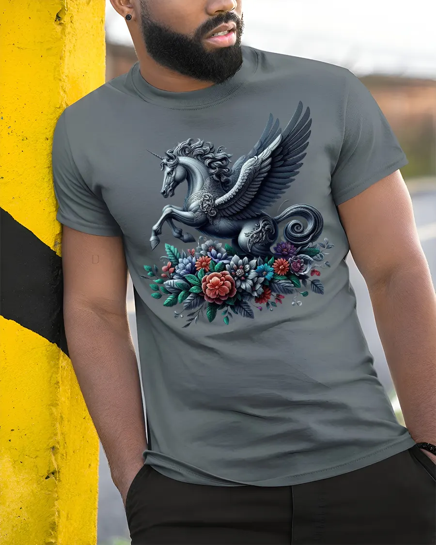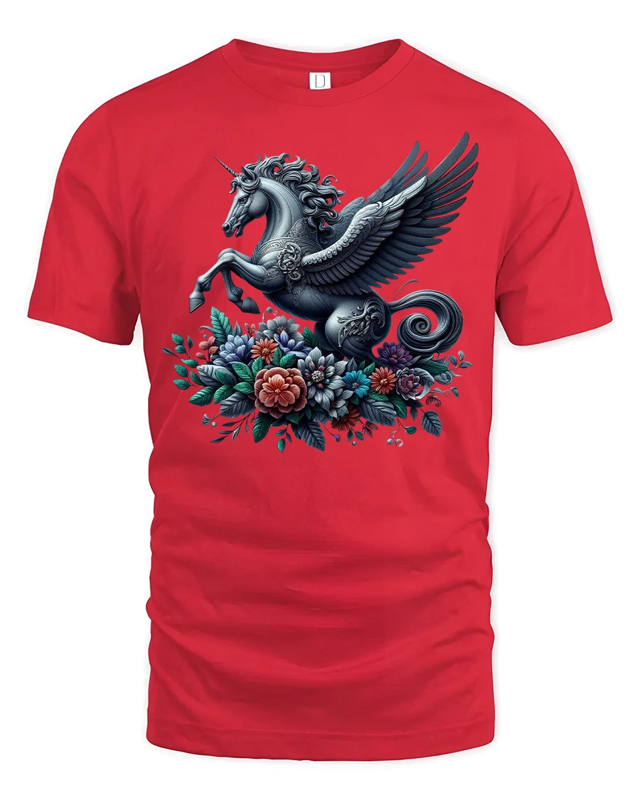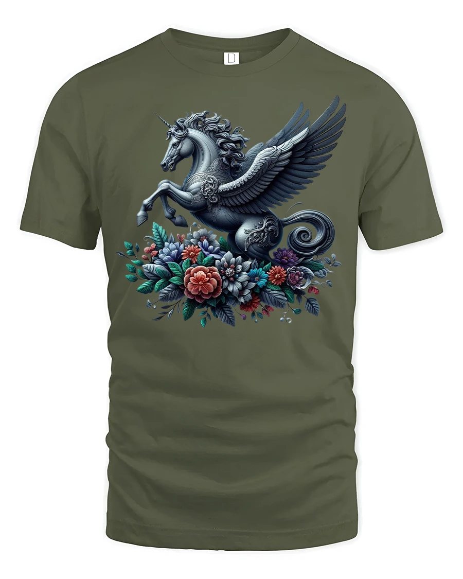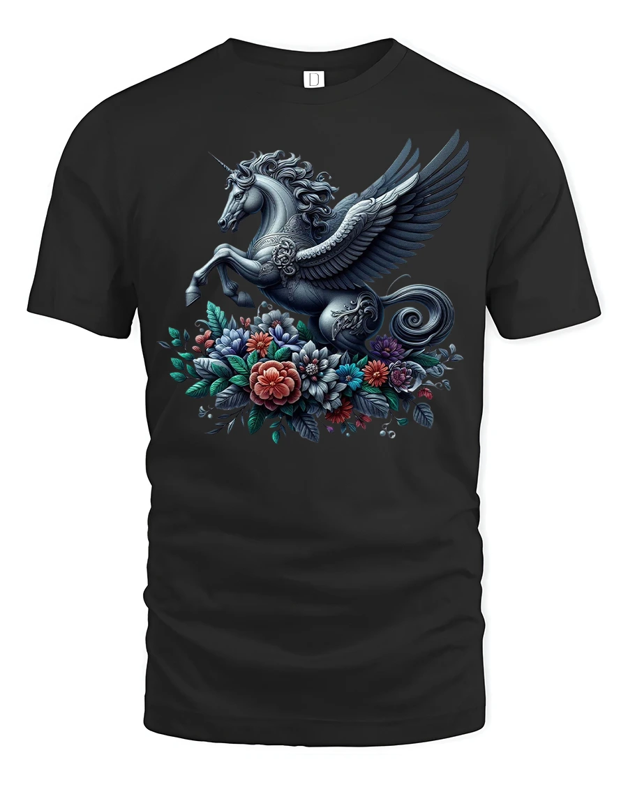 Take flight into fantasy with this Pegasus Unicorn Floral Fantasy Art Graphic T-Shirt, a stunning fusion of strength, beauty, and imagination.