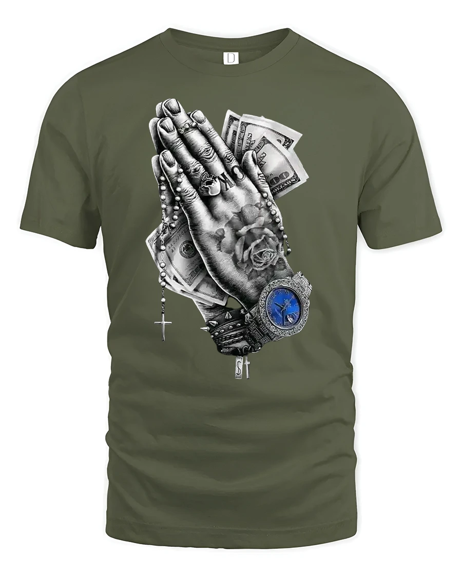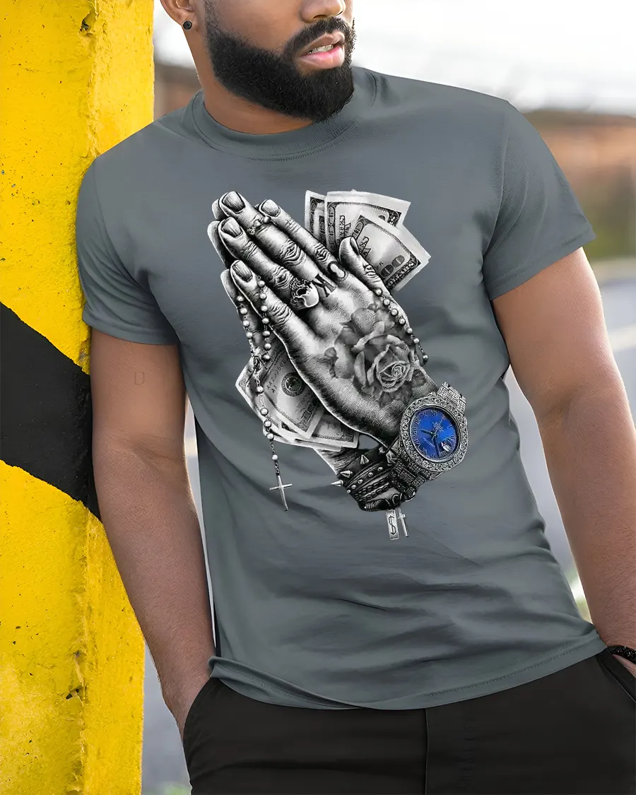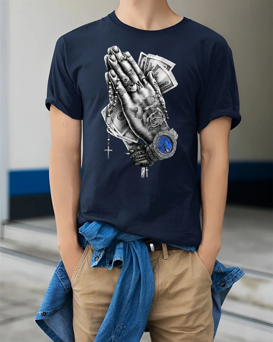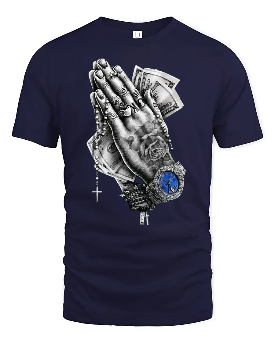 Praying Hands Money Watch Graphic Streetwear T-Shirt combines urban art with bold symbolism, making it a standout piece for anyone who loves expressive street fashion. The design features detailed praying hands holding cash, with a rosary, rings, and a luxury watch for a strong mix of faith and hustle. It’s a powerful statement that reflects the balance between spirituality and ambition.